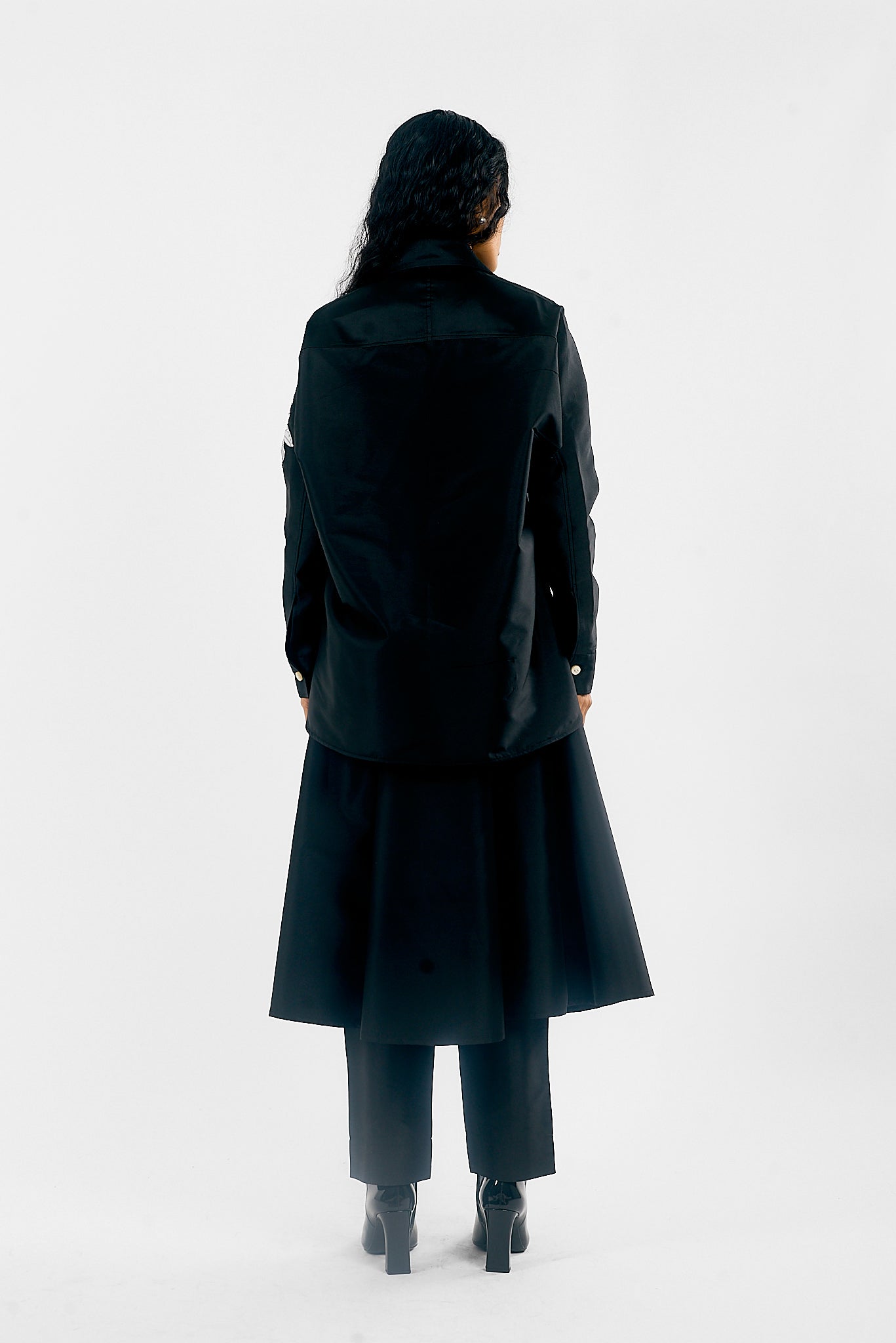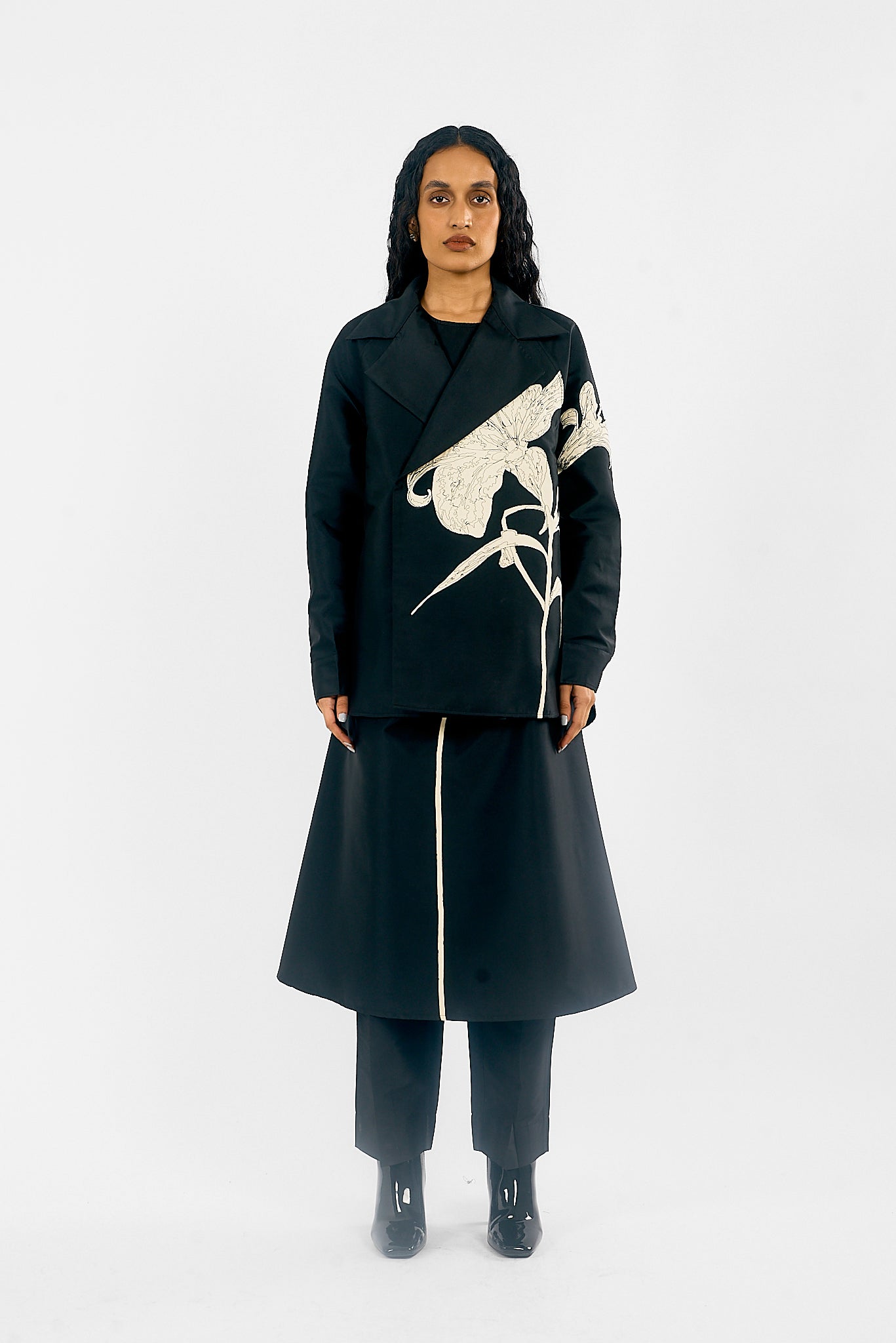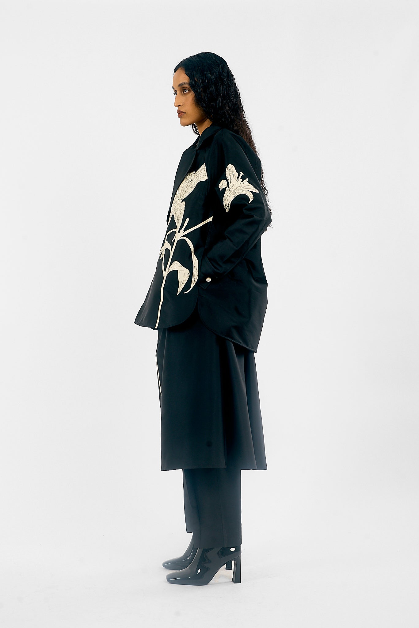 This double-breasted taffeta jacket with drop-shoulder sleeves and lily patchwork, offering a relaxed yet elegant silhouette with artistic detailing.