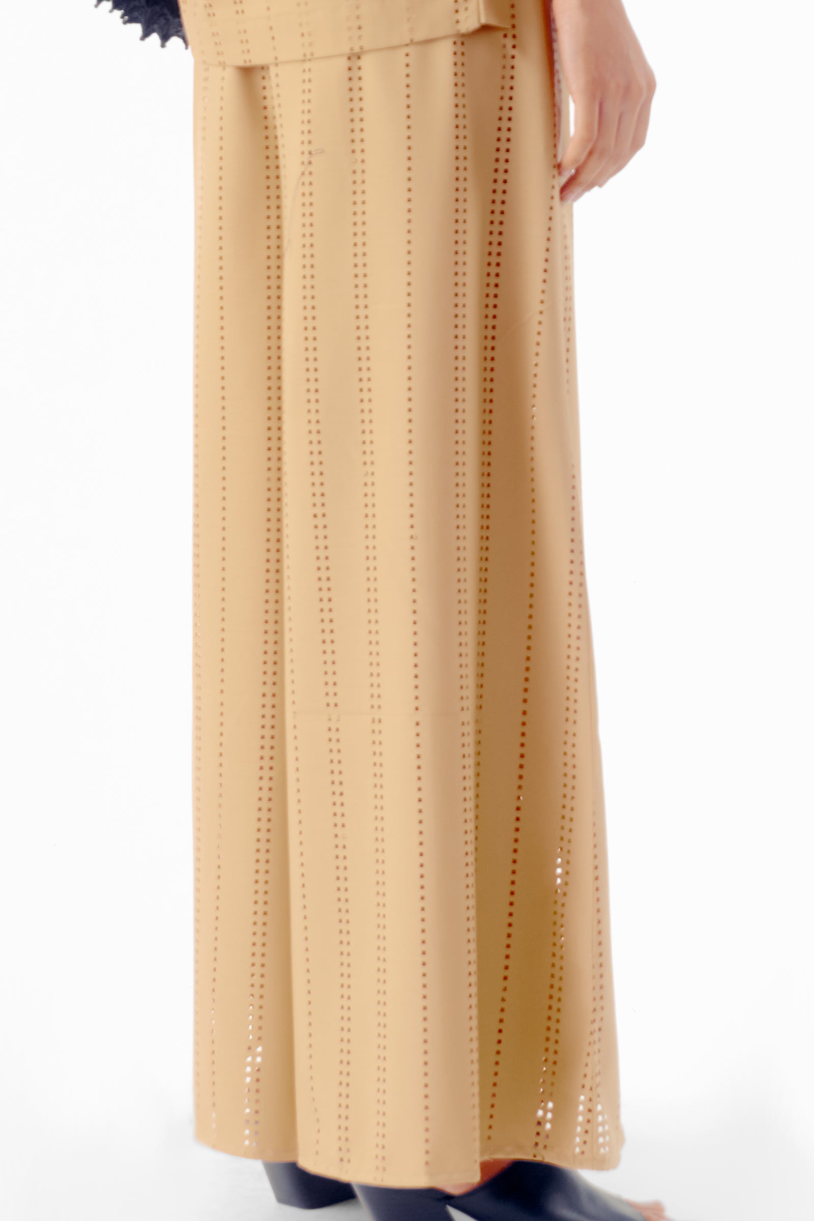 This laser-cut flared trousers are modern pants with intricate patterns made using laser technology. They have a fitted waist and flare out at the legs, combining sleek design with precise detailing for a fashionable statement.