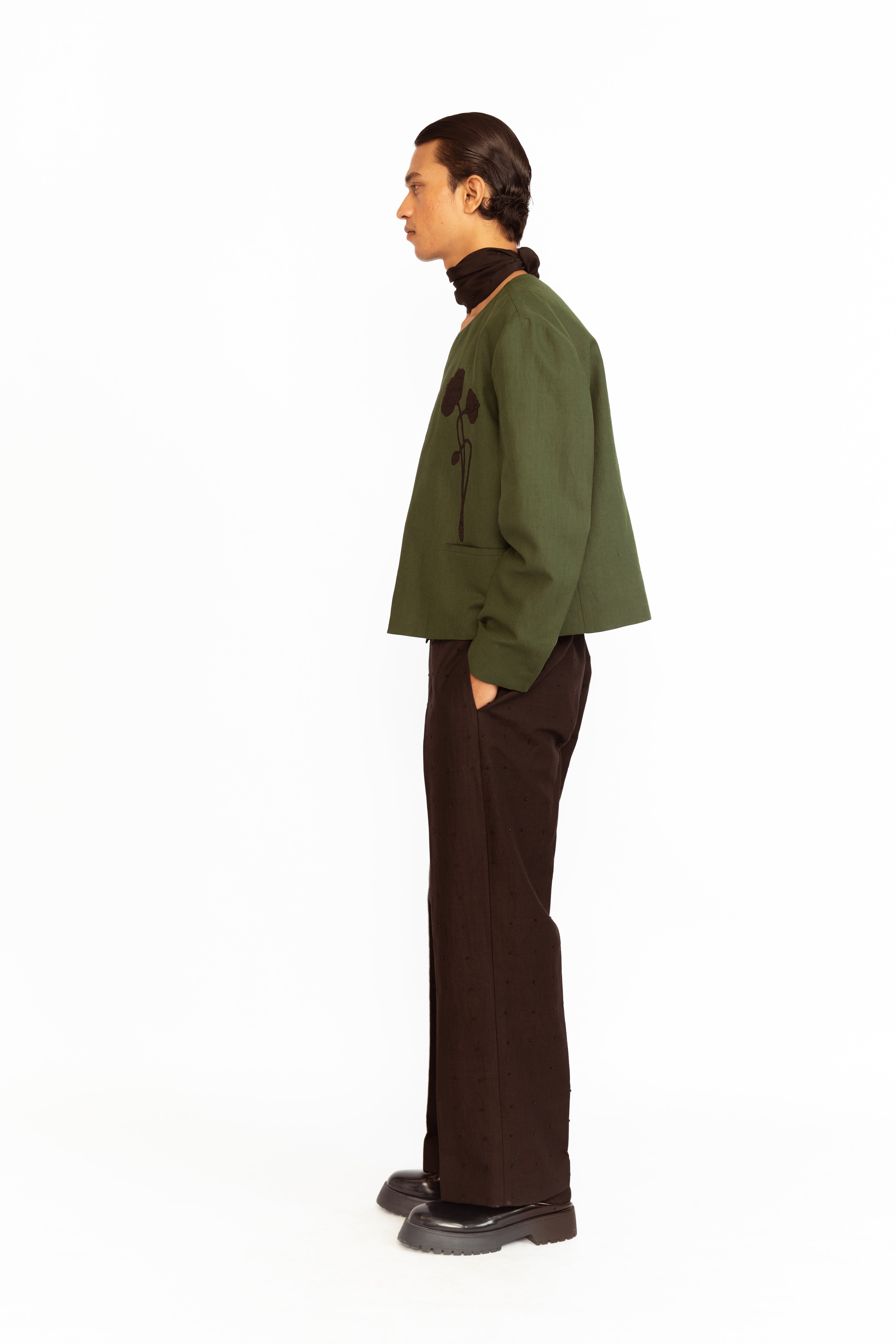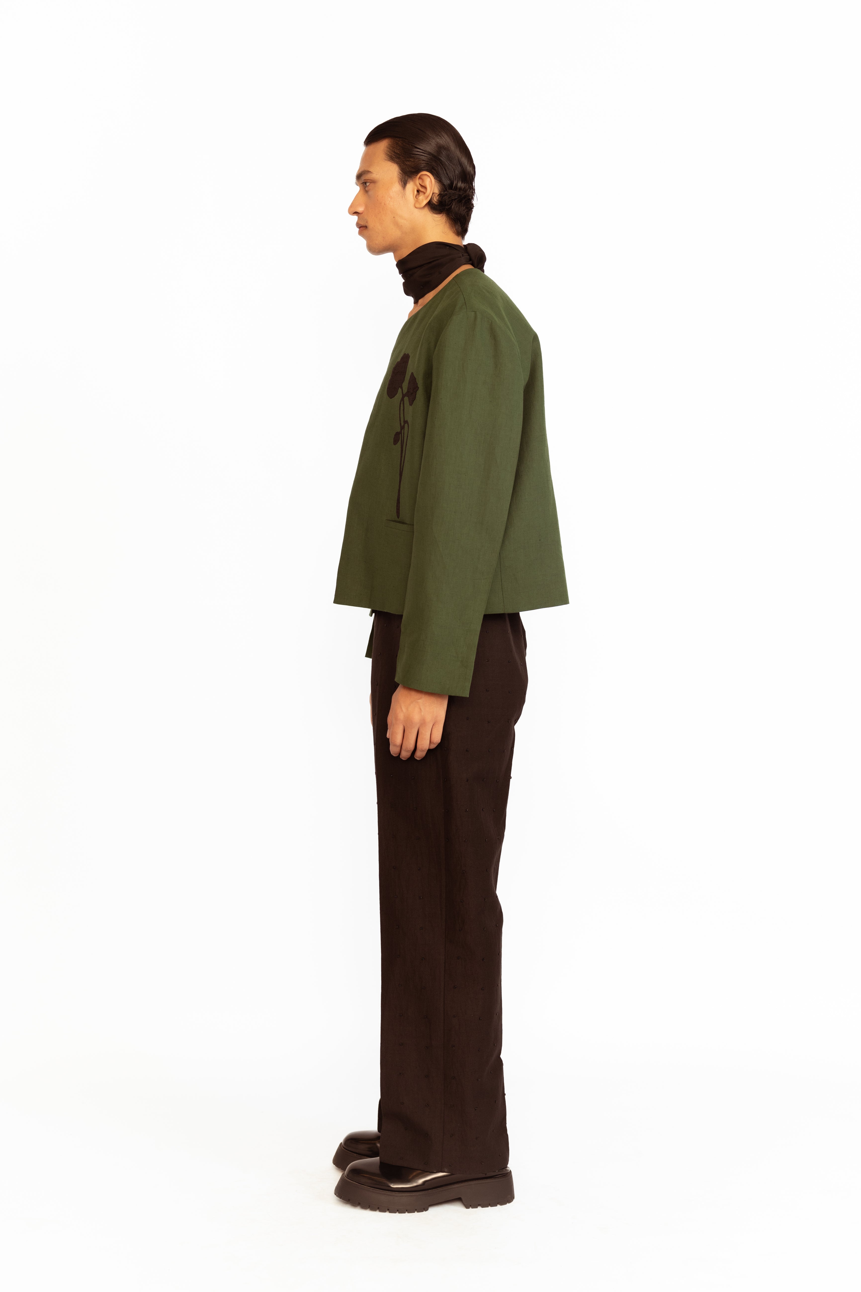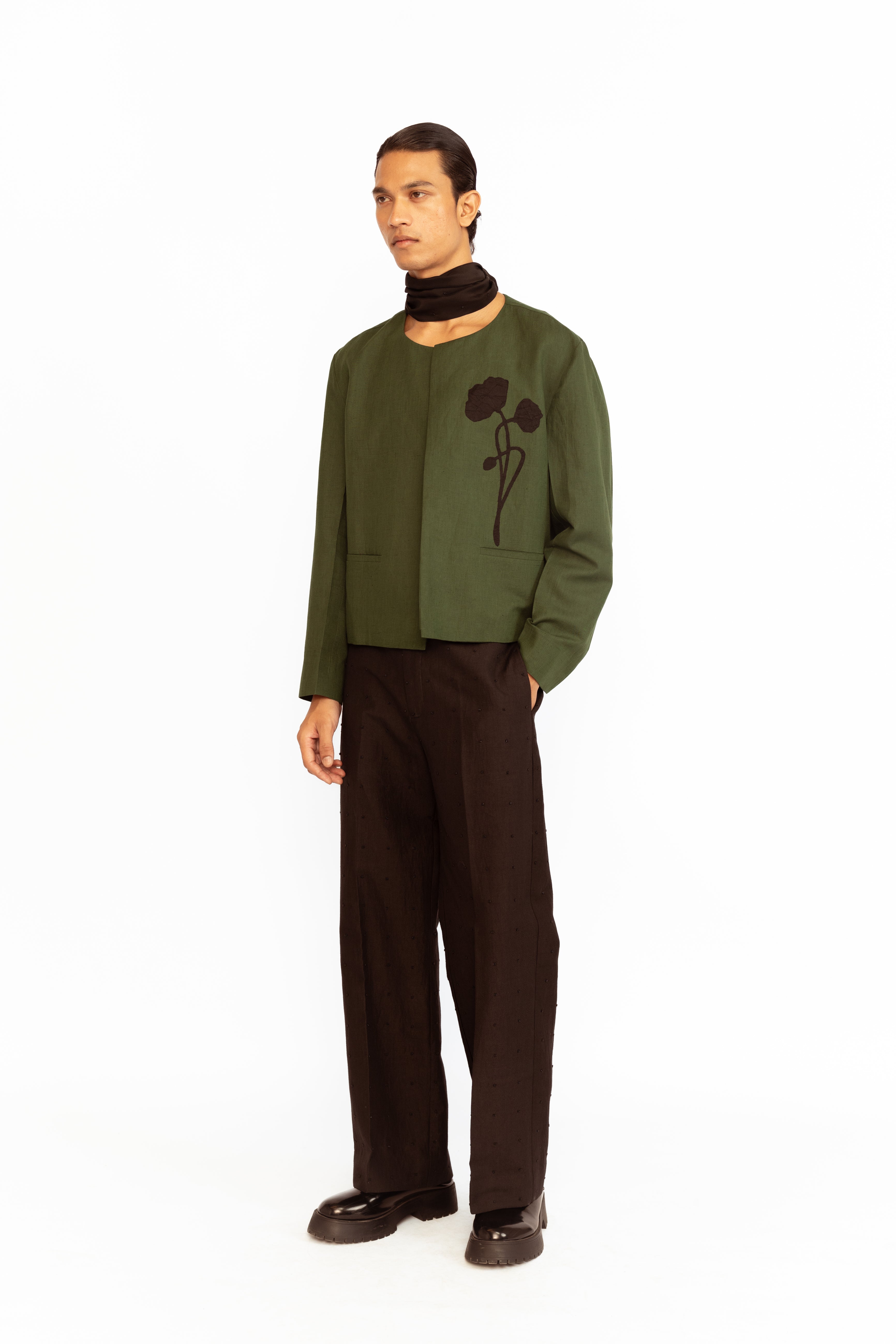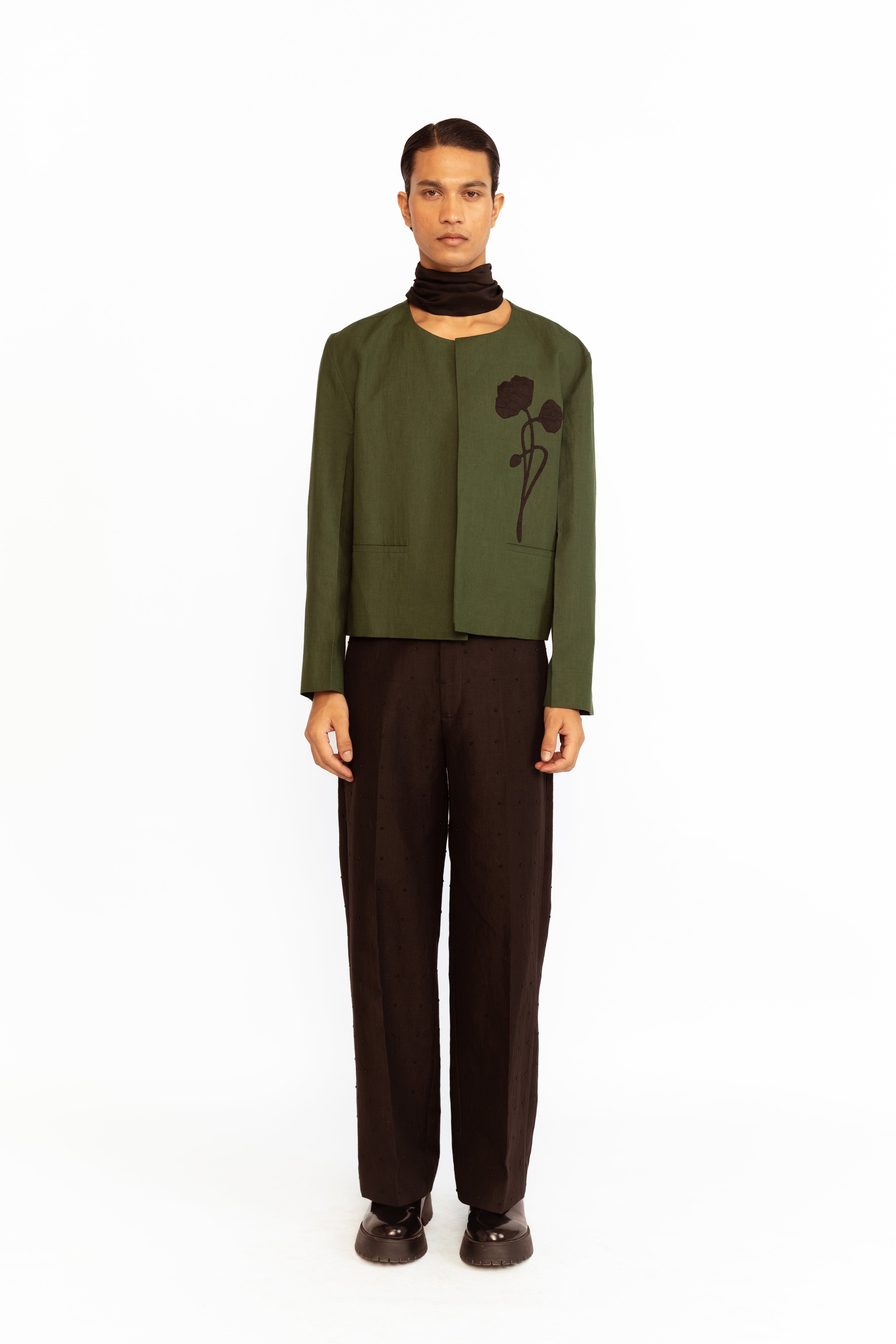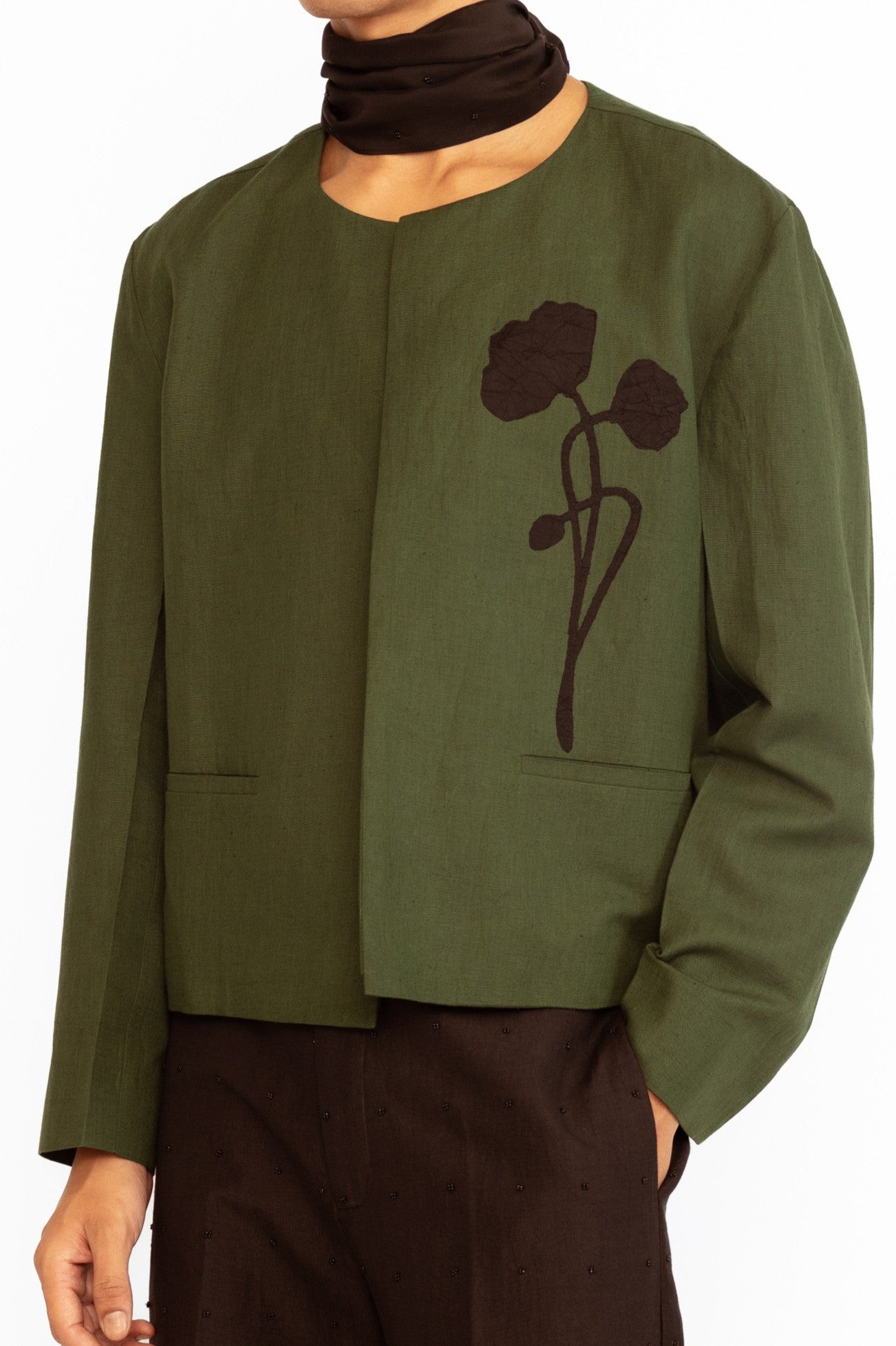 A refined layer, this round-neck jacket is adorned with two floral appliques and finished with front pockets — blending subtle embellishment with clean structure.