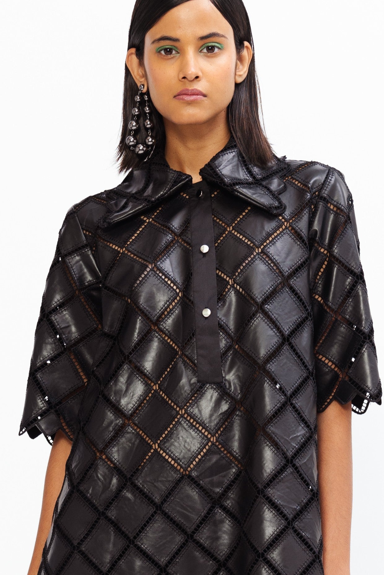 A midi dress crafted in luxurious lozenge leather mesh, rendered in a deep onyx hue. The fitted silhouette and intricate texture create a striking balance of elegance and modern allure, making it a perfect choice for refined evenings and sophisticated occasions.