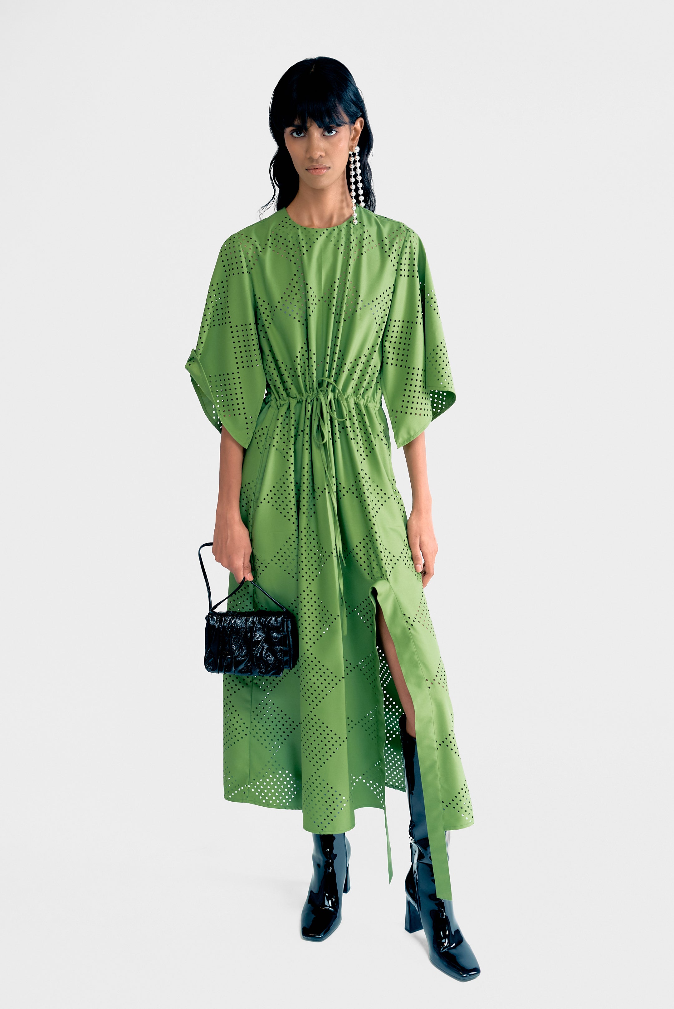 Elegant and contemporary, this cape-sleeved dress features intricate laser-cut detailing for a sophisticated touch. The adjustable drawstring detail enhances the fit, adding a stylish and versatile element. Perfect for chic, effortless dressing.