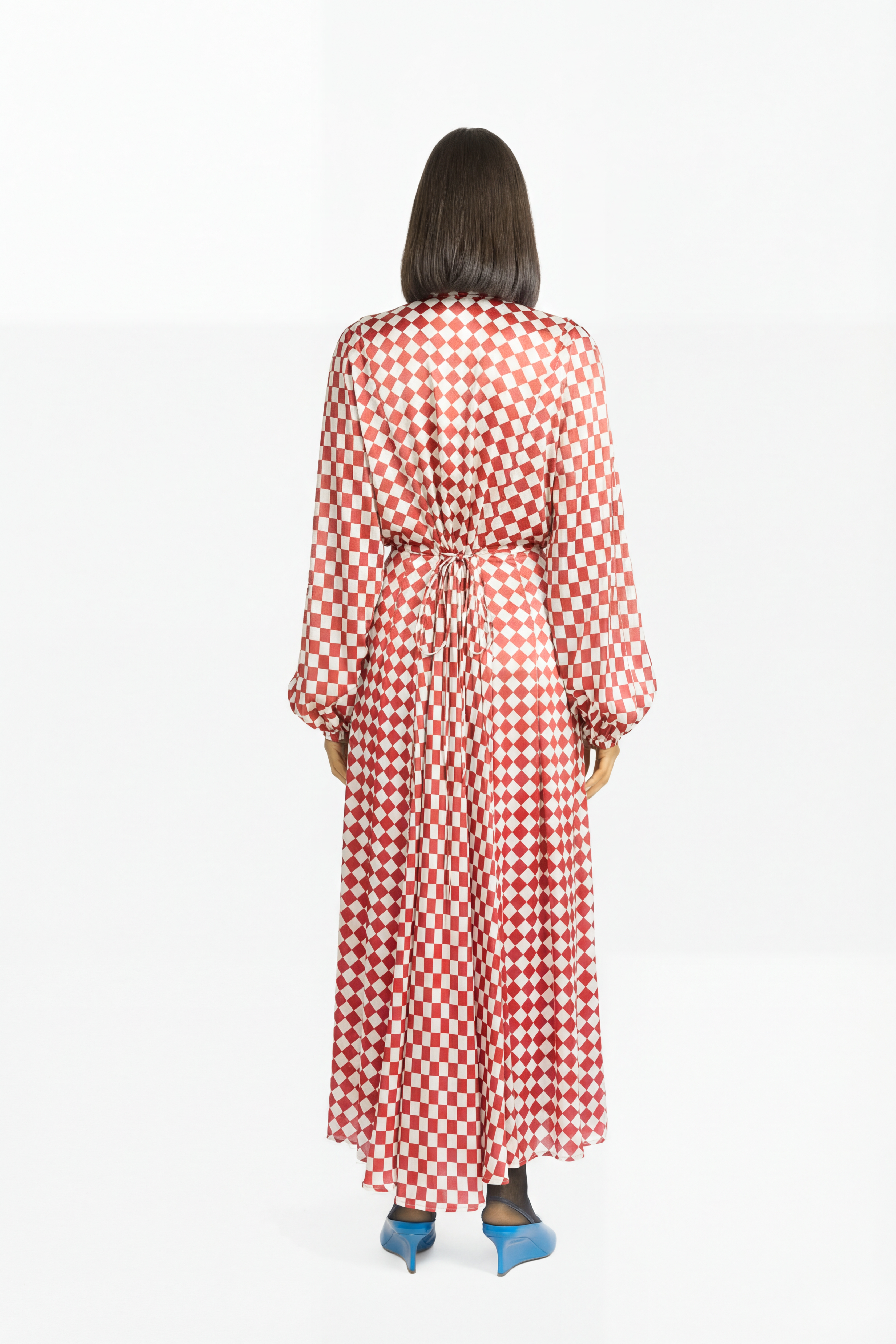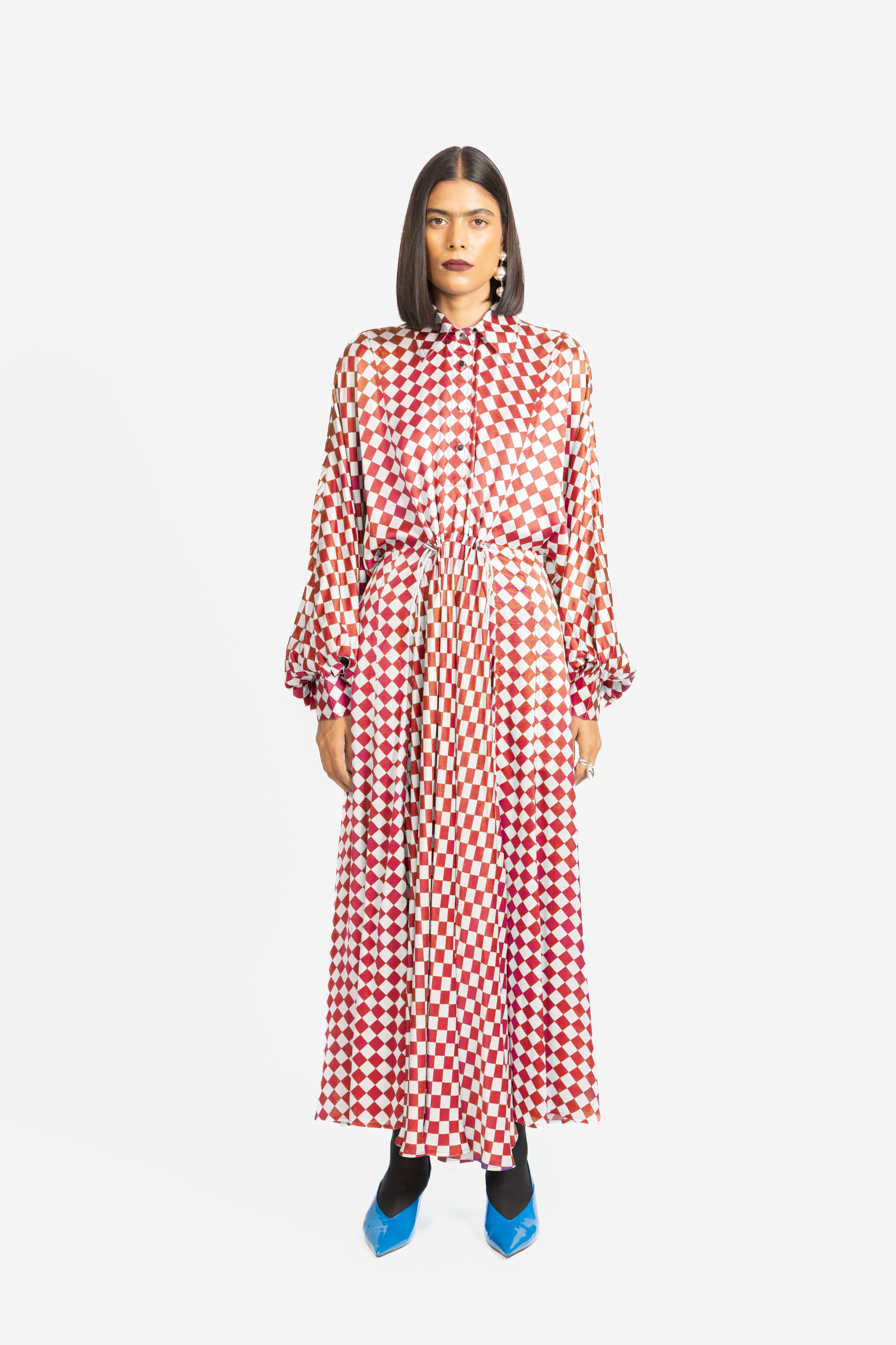 A statement maxi shirt dress featuring a bold graphic print and a cinched waist for a defined silhouette. Combining structure with flow, it offers a striking yet effortlessly elegant look.