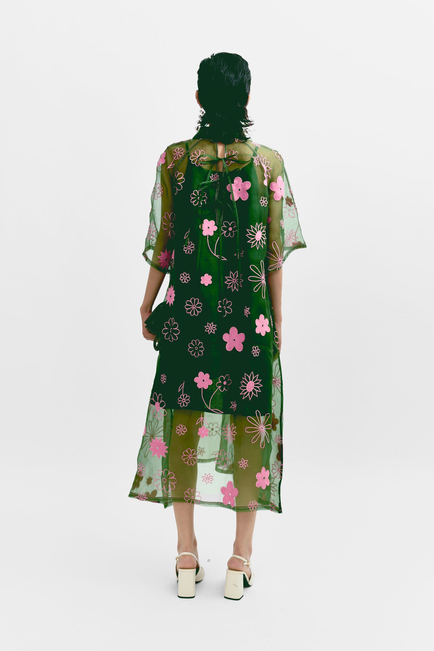 Half placket organza dress with floral embroidery and contrast top stitch. comes with cotton slip.