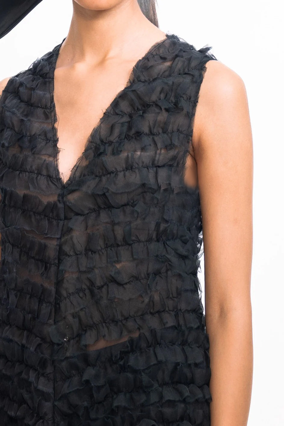 Effortlessly feminine, this sleeveless dress features a flattering V-neckline and delicate diagonal ruffles that create beautiful texture across the bodice and skirt. Cut in a sleek straight silhouette, it offers a modern alternative to classic fit-and-flare styles, perfect for both daytime celebrations and evening occasions.