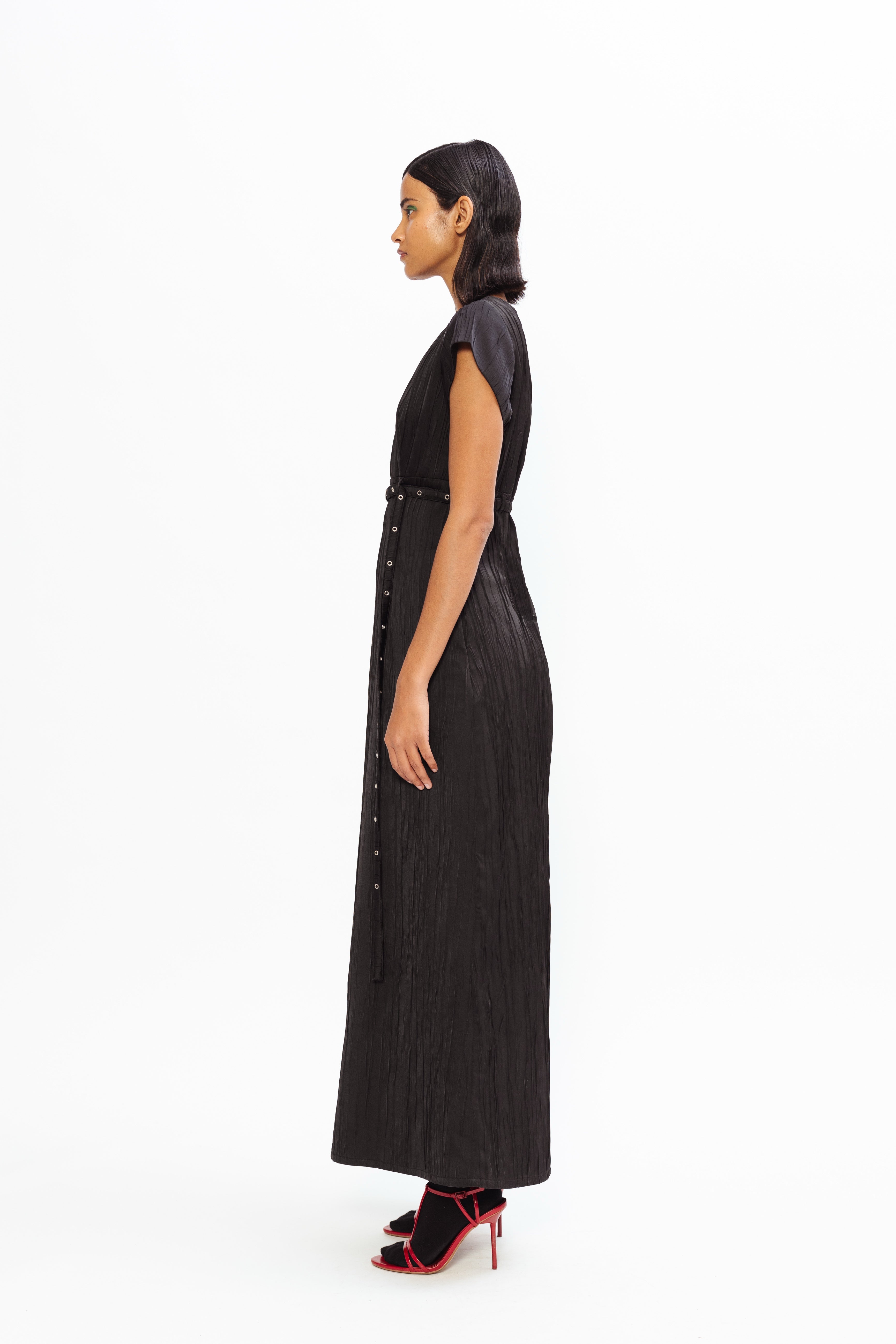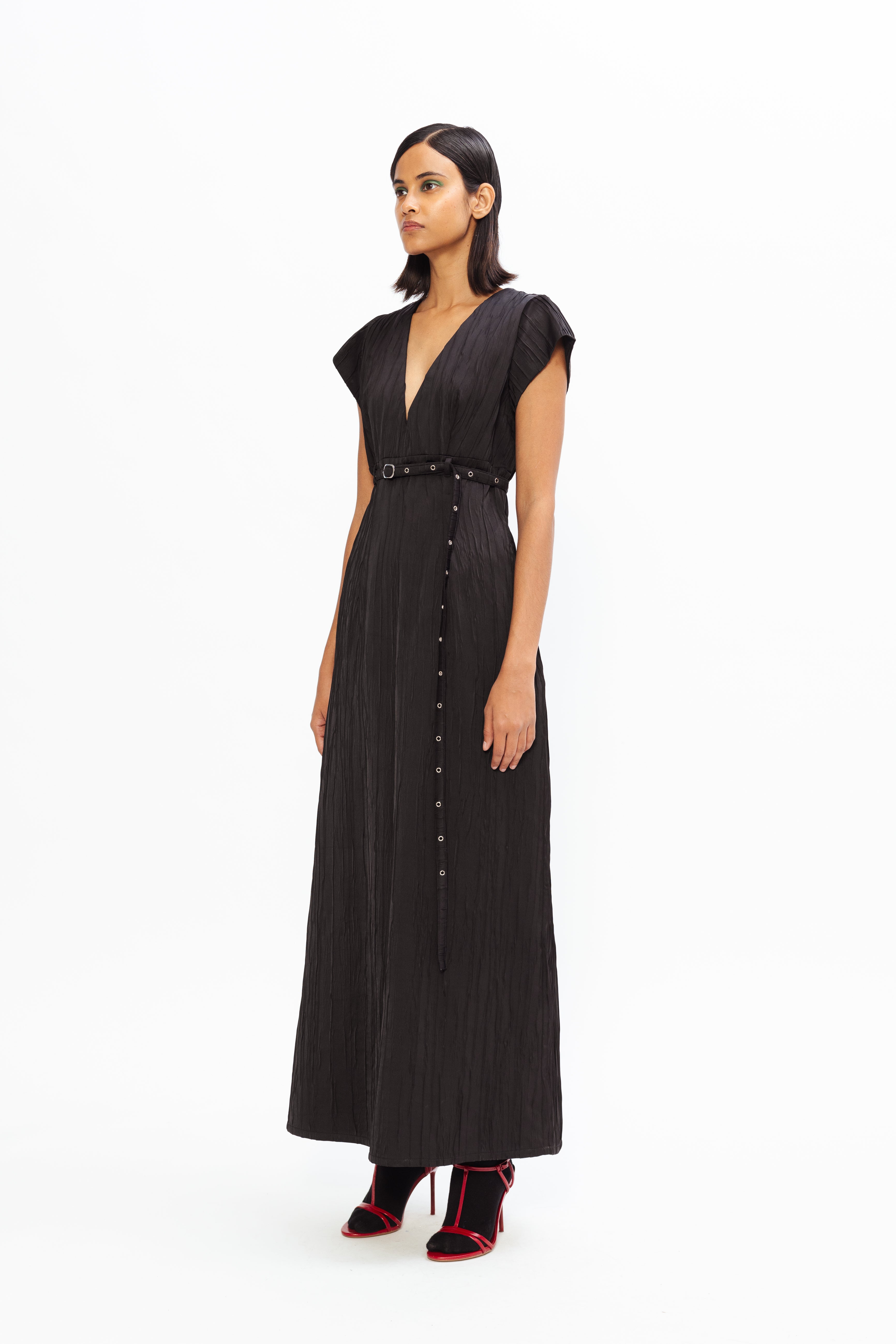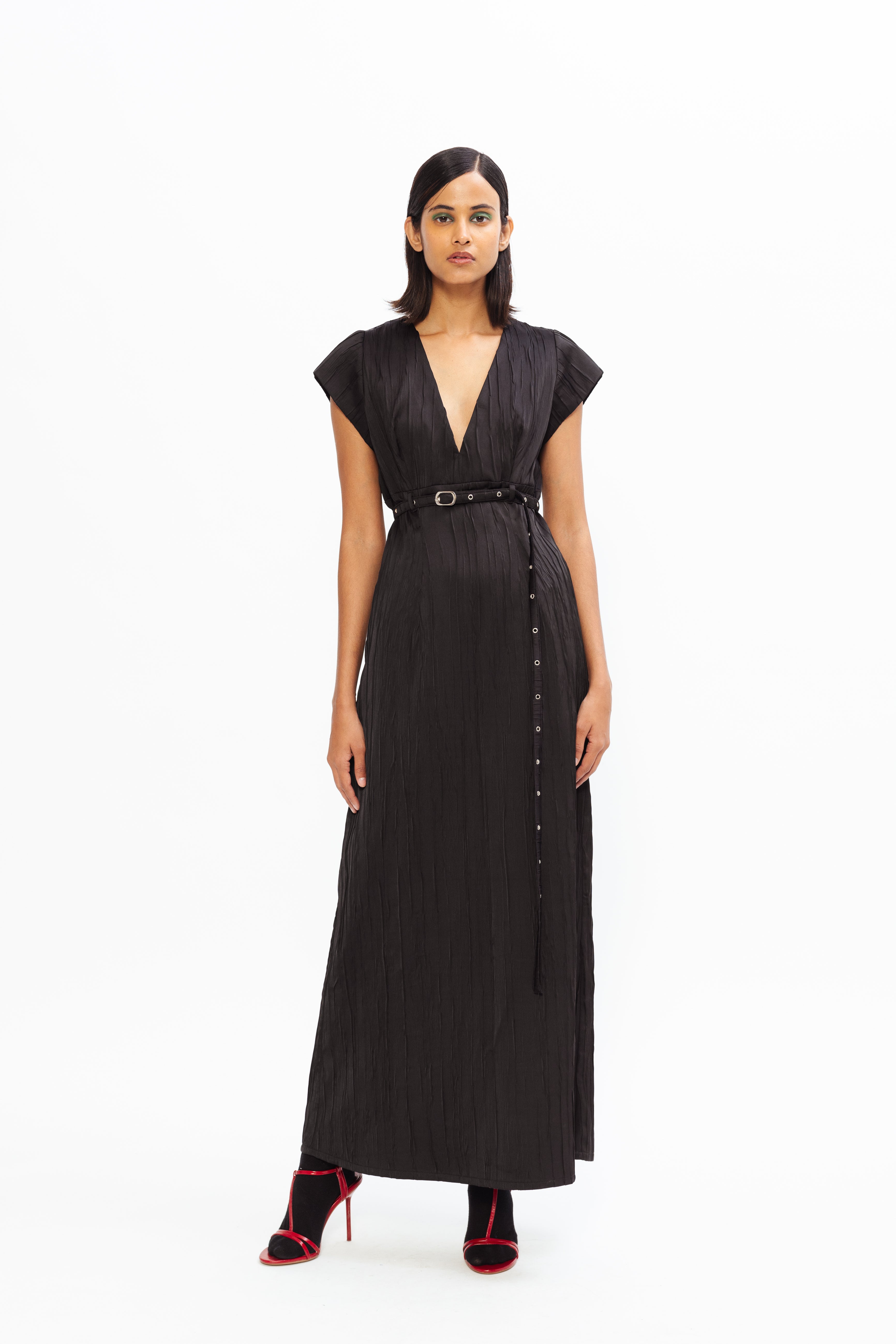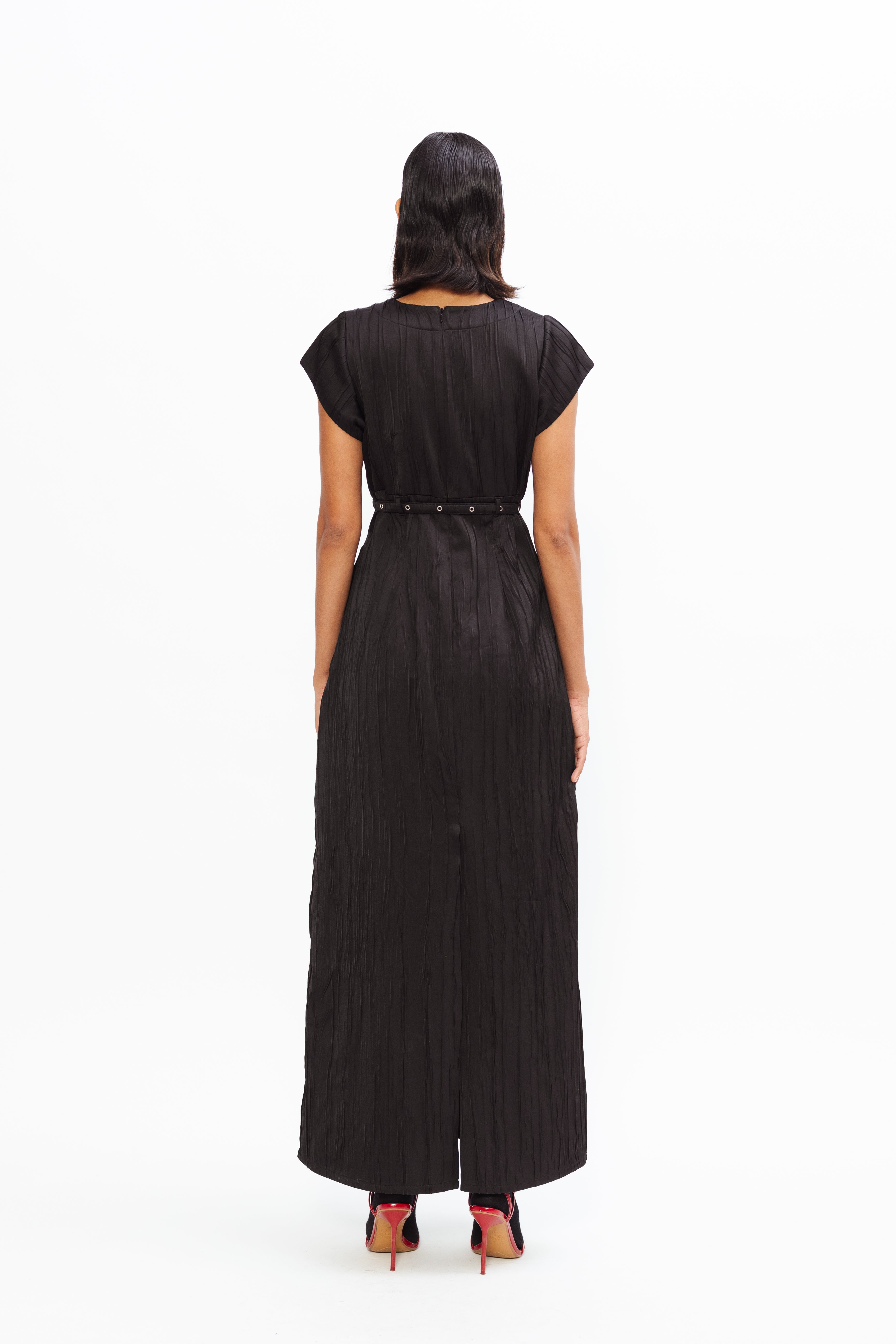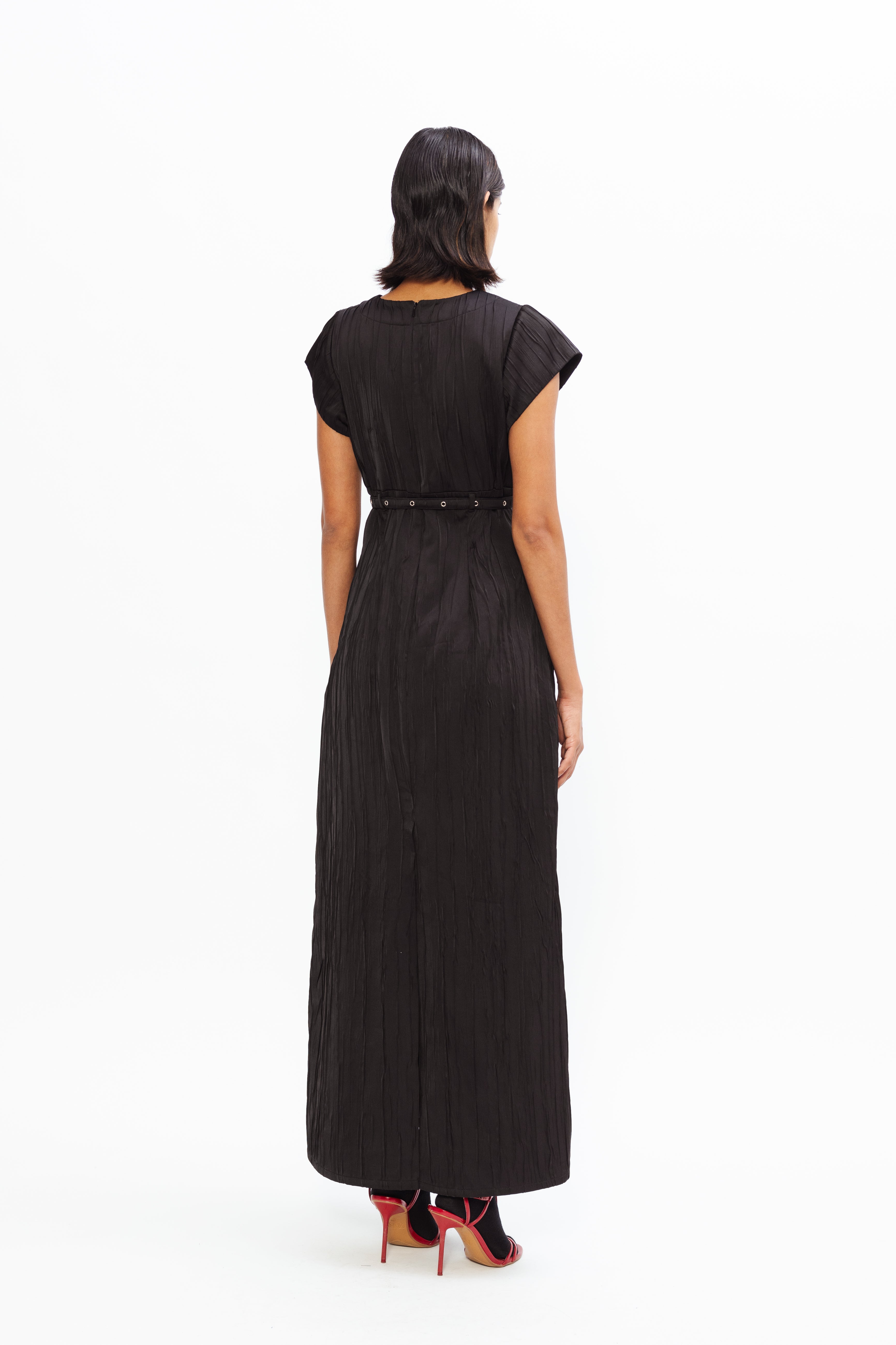 This floor-length dress features a streamlined silhouette with a gentle flare, creating a look of effortless grace. Crafted from textured fabric with subtle crinkle detailing, it adds depth and visual interest. Exuding minimalistic elegance with a modern edge, it’s the perfect blend of sophistication and simplicity.