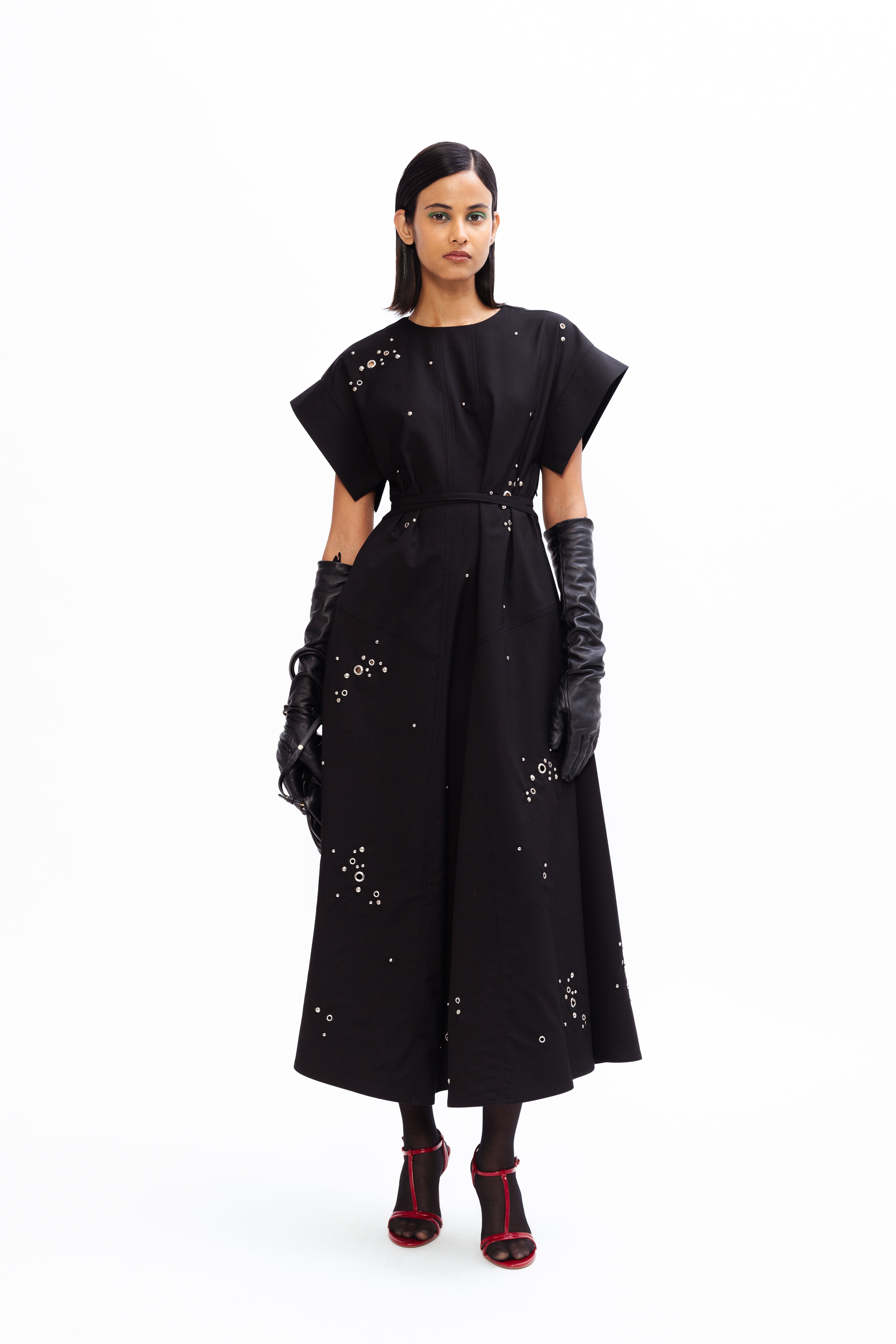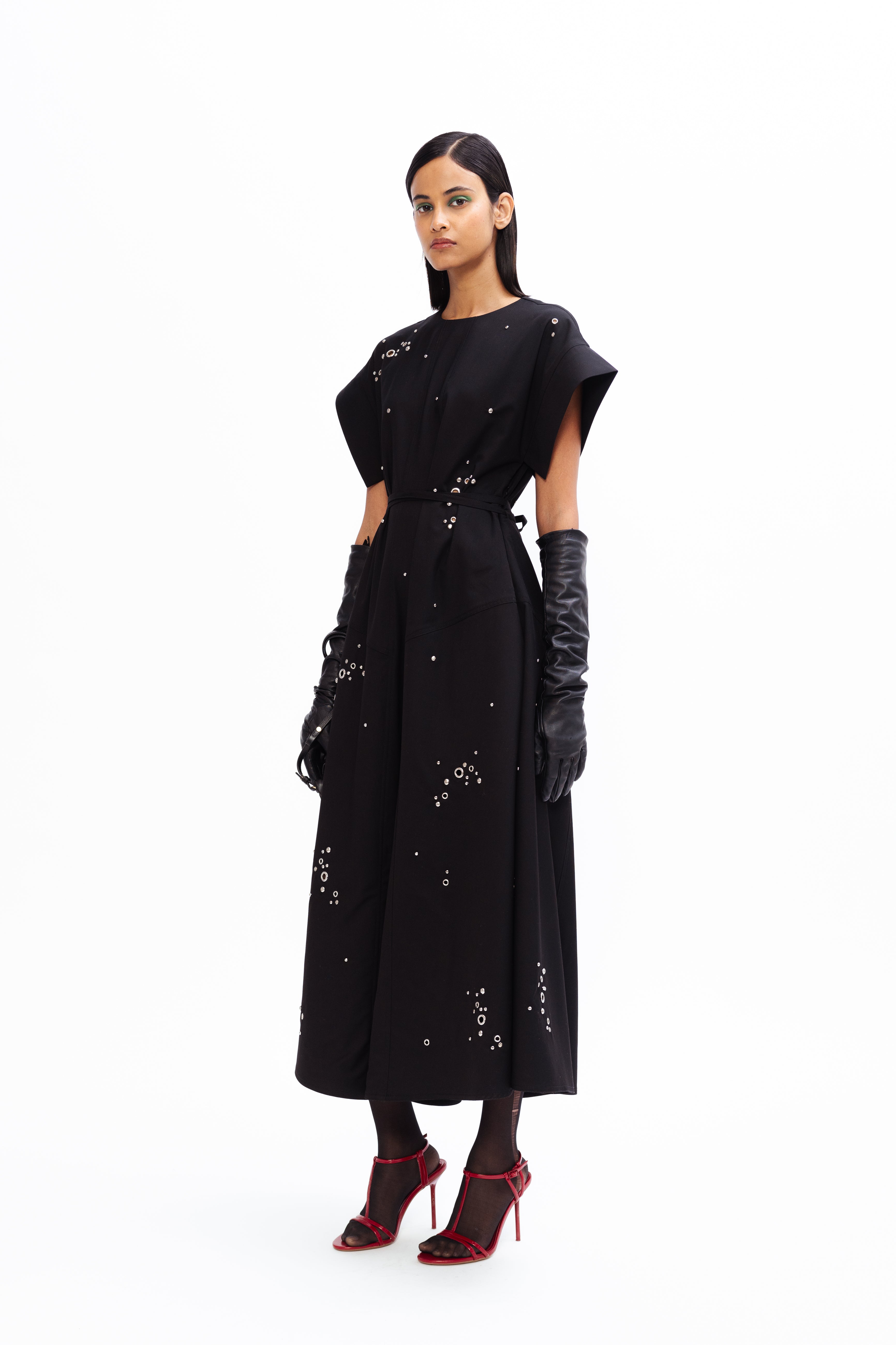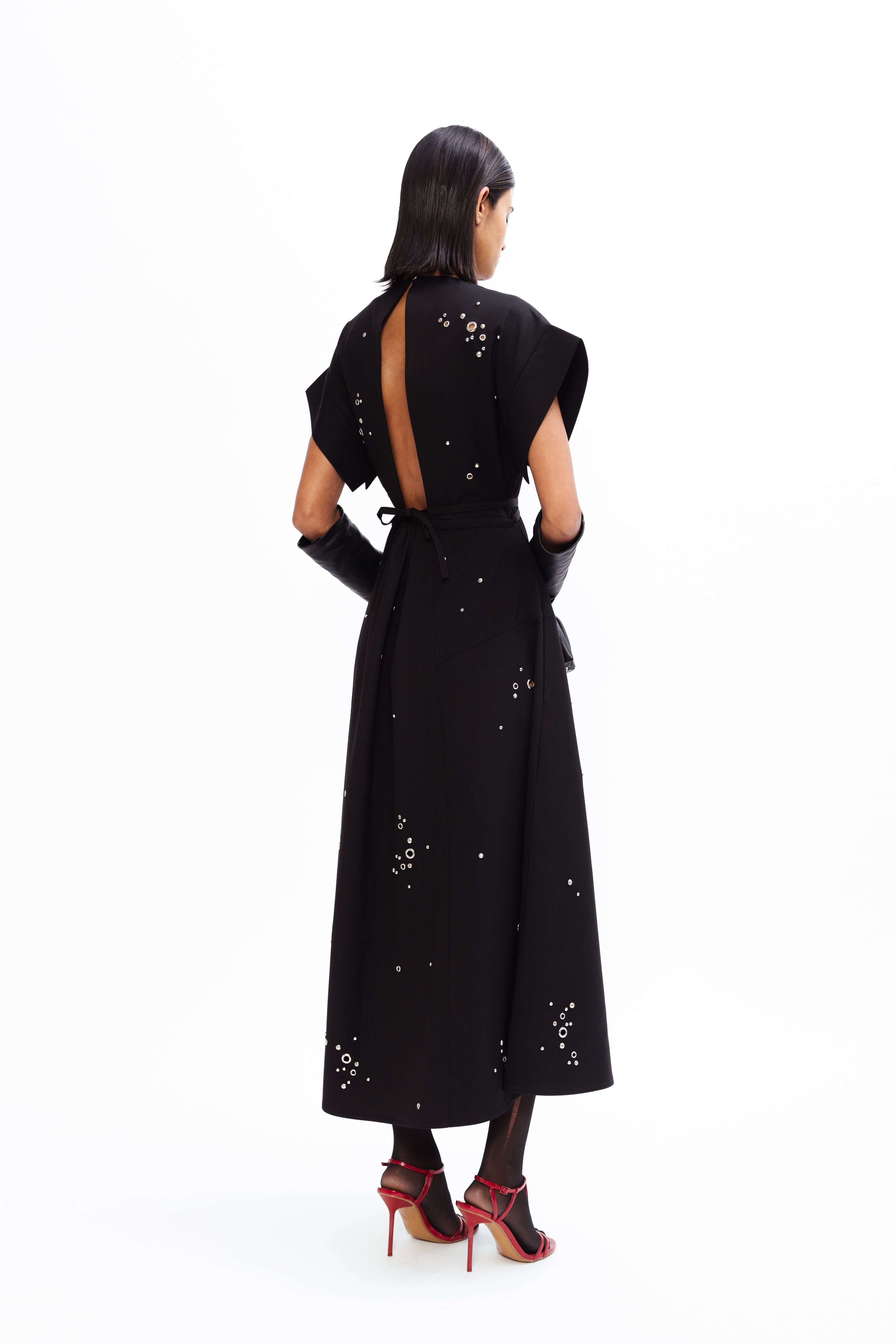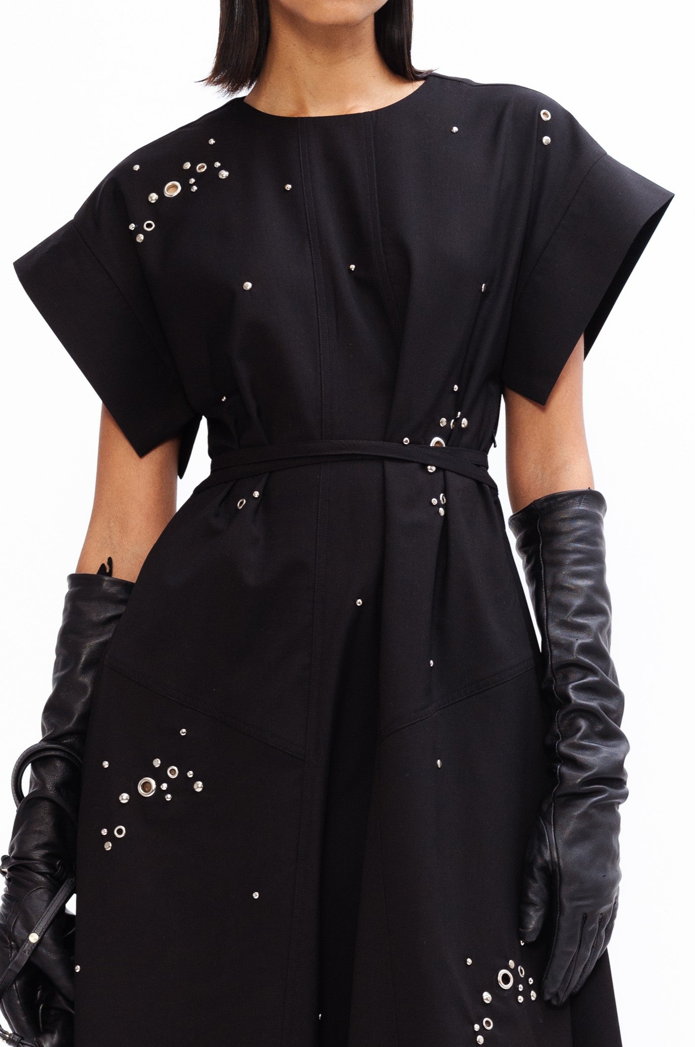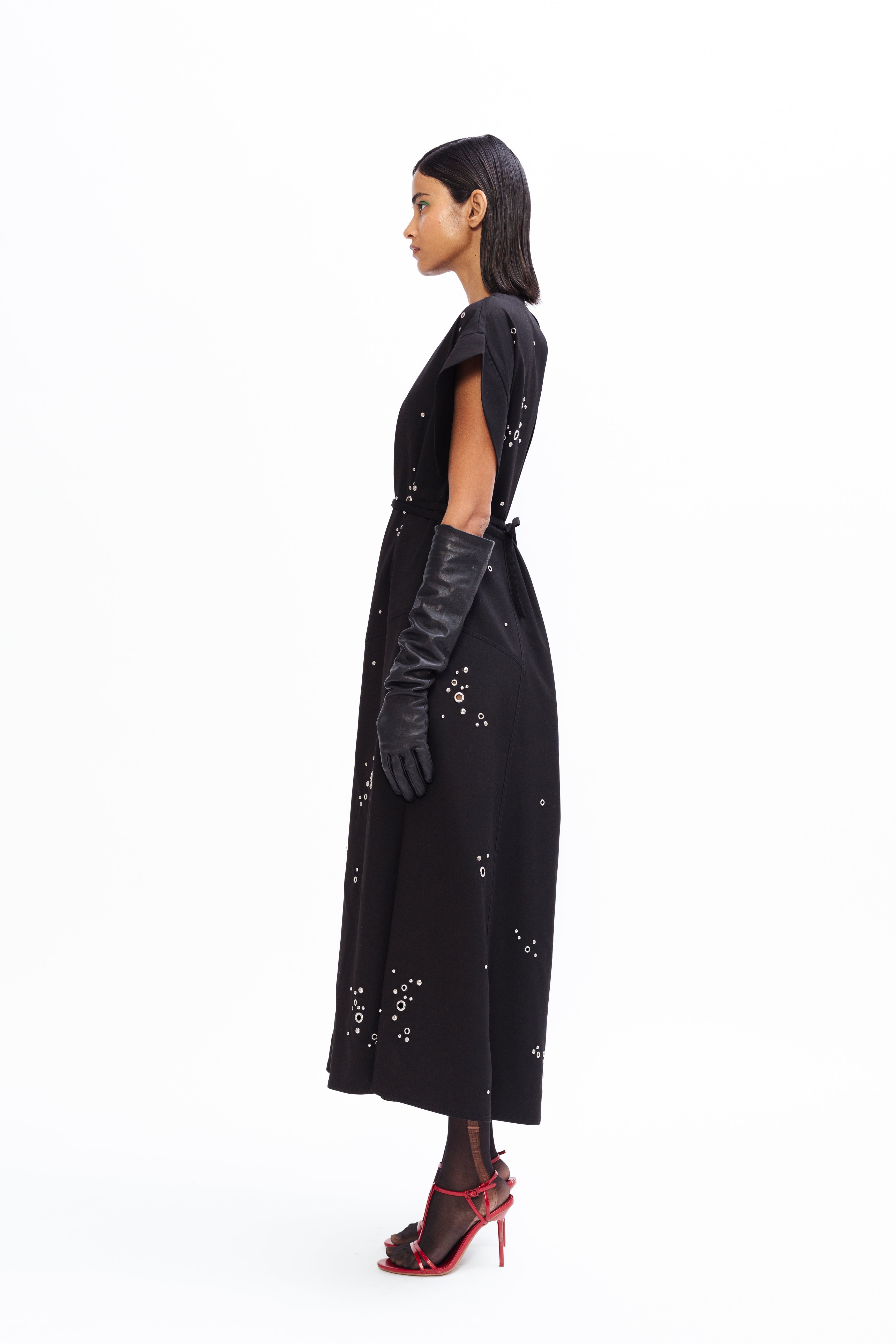 This black dress combines structure with fluidity, creating a refined yet modern silhouette. Adorned with small metallic eyelet embellishments scattered across the fabric, it adds a subtle sparkle and contemporary edge. Perfect for evening events, galas, or upscale gatherings, it strikes the ideal balance between elegance and bold sophistication.