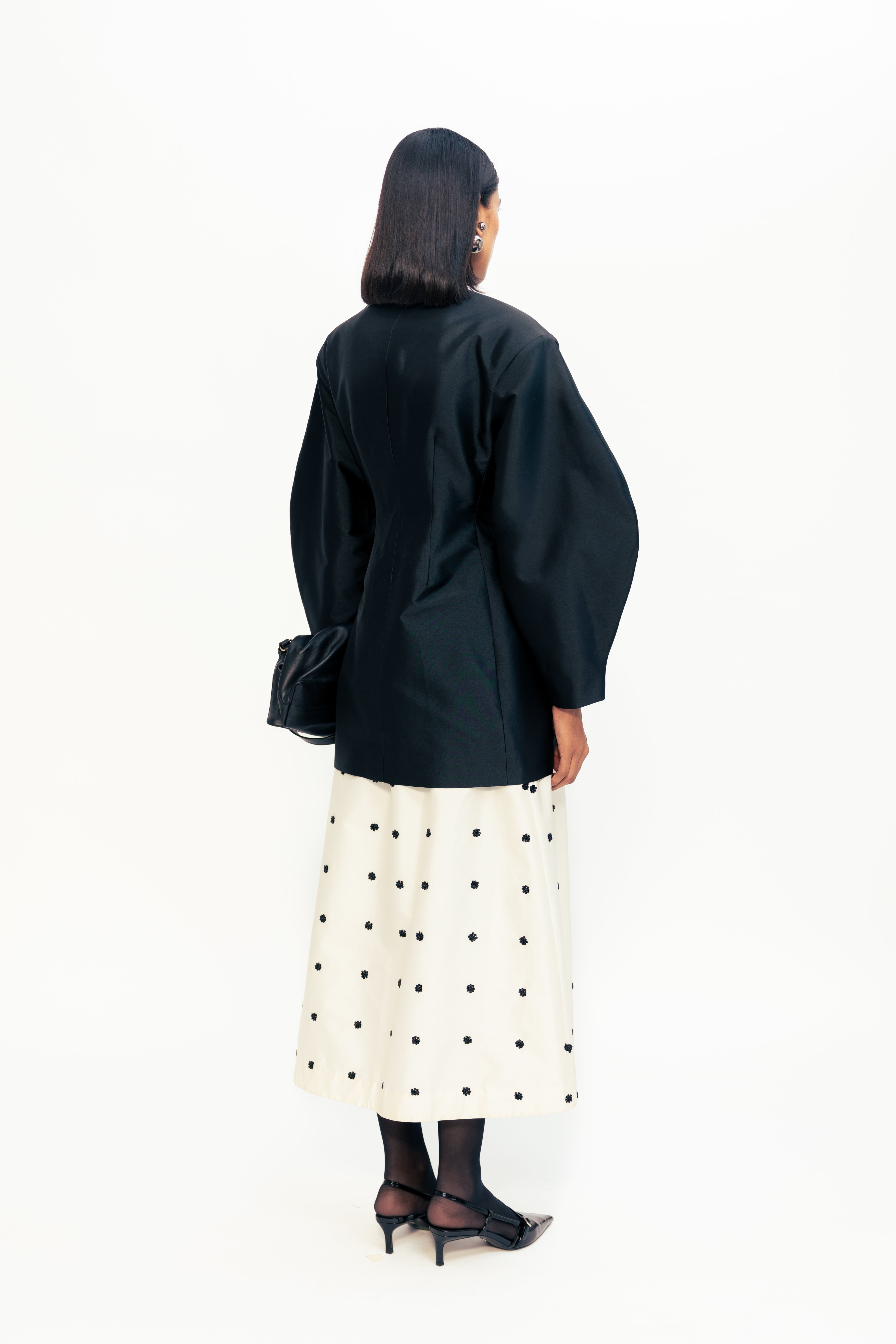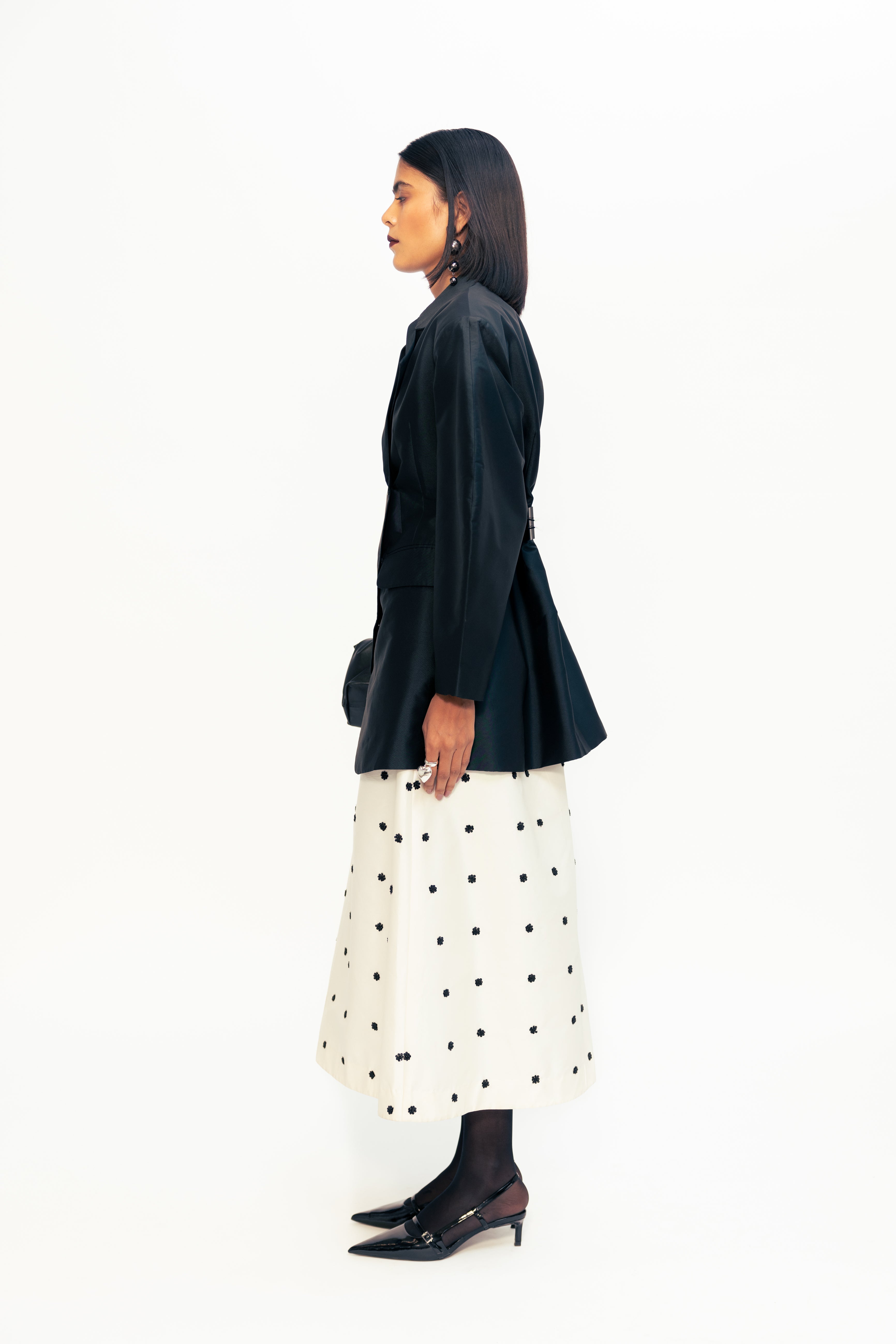 An A-line skirt embellished with shimmering sequins arranged in a modern grid pattern, adding subtle sparkle to any look.