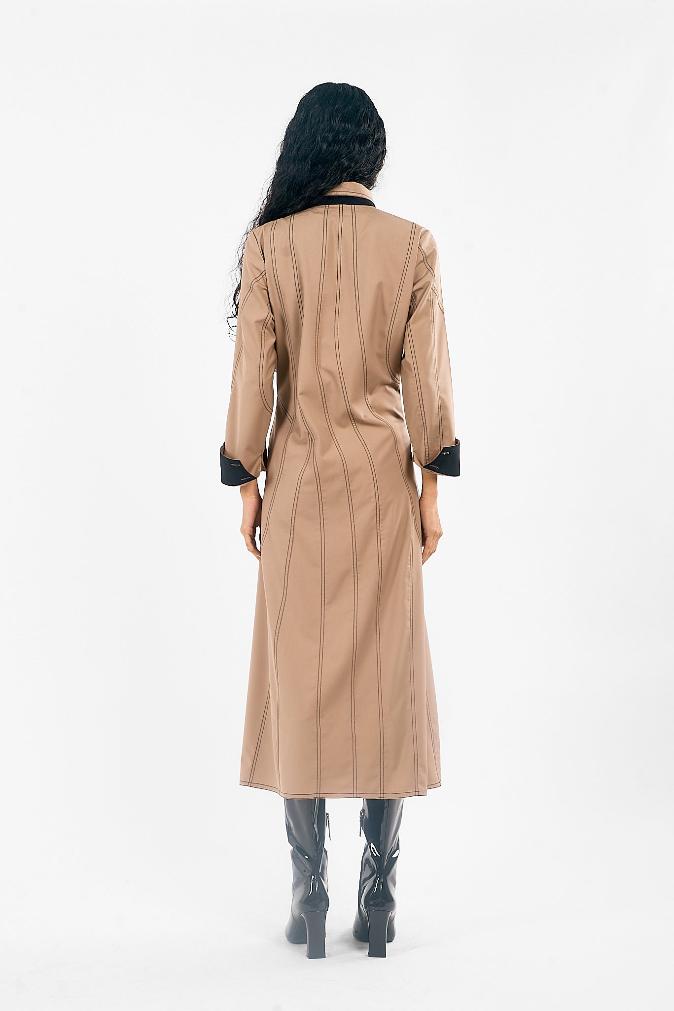 This full-sleeved paneled dress with a slant placket and contrast topstitching combines structured panels with modern detailing for a sophisticated and versatile look