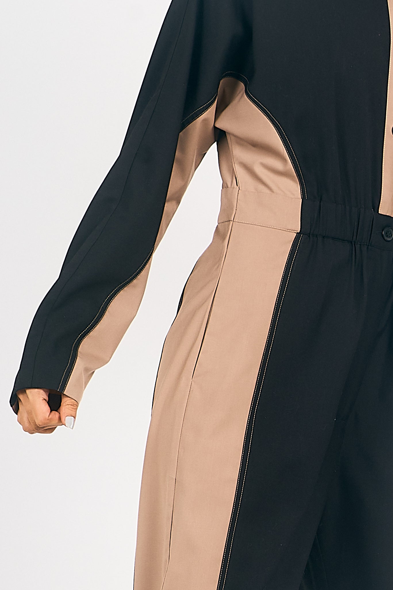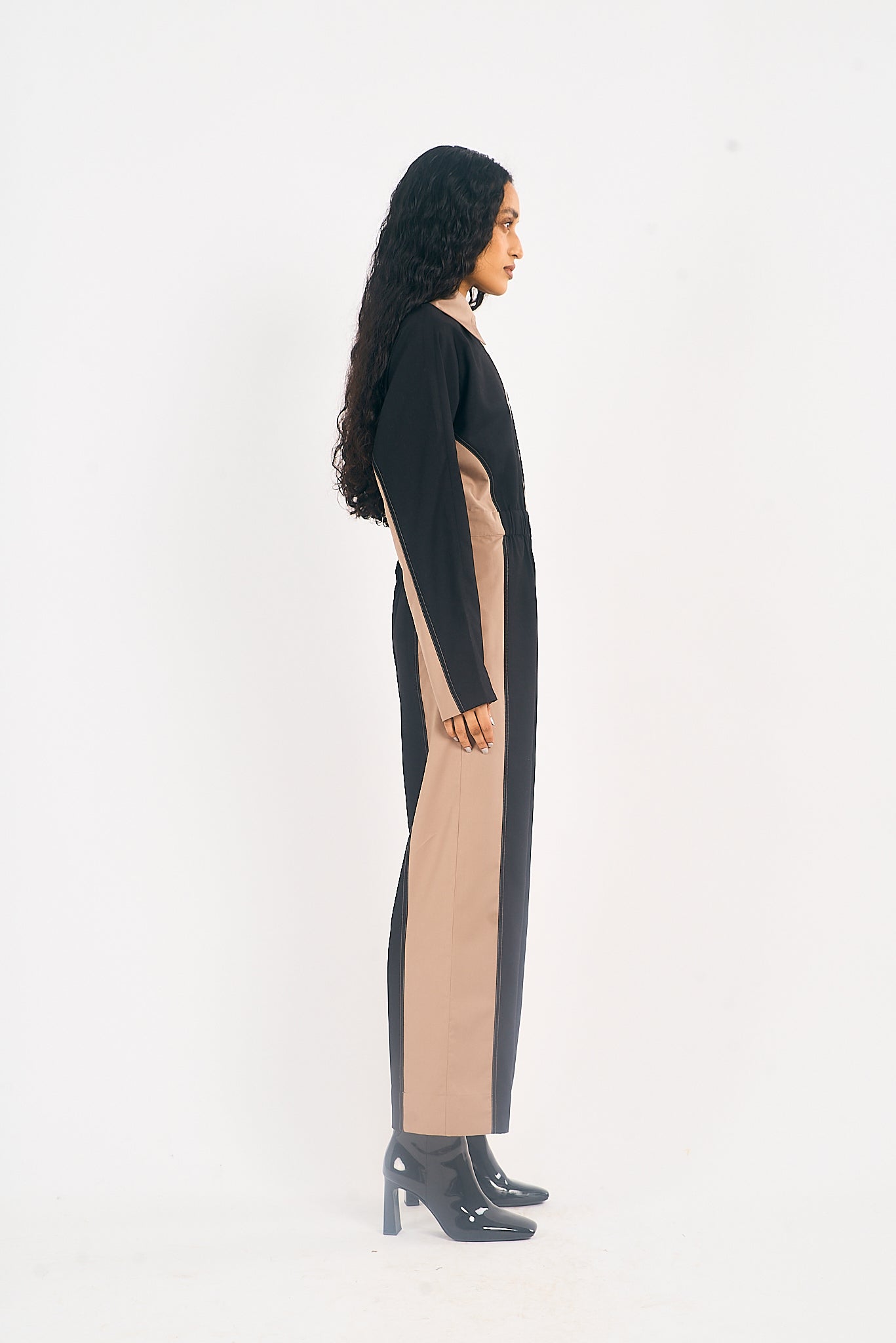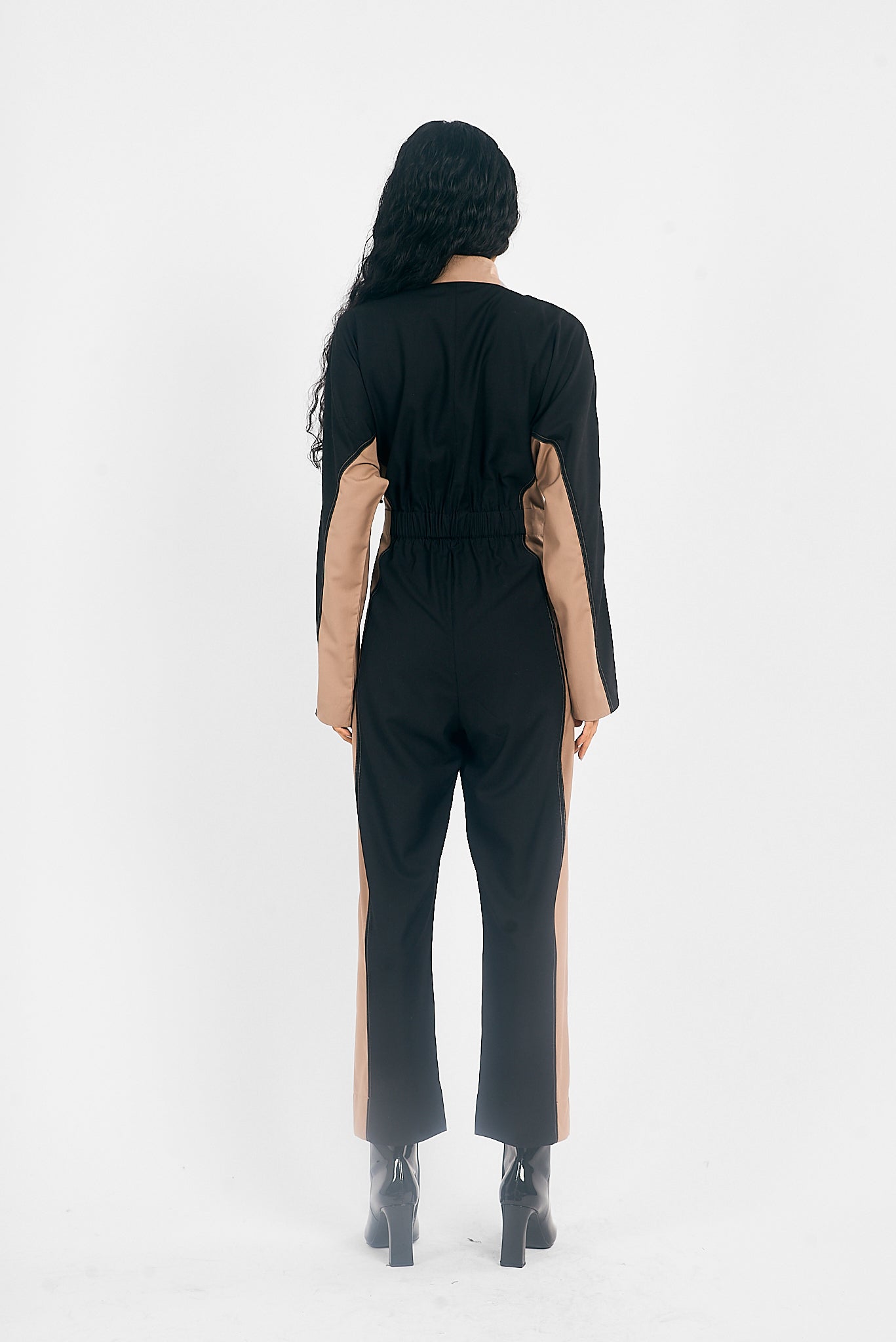 This color-block jumpsuit with adjuster tab sleeves, featuring a bold mix of contrasting colors. The adjustable sleeves provide a customizable fit, adding both versatility and style to this contemporary, chic design.