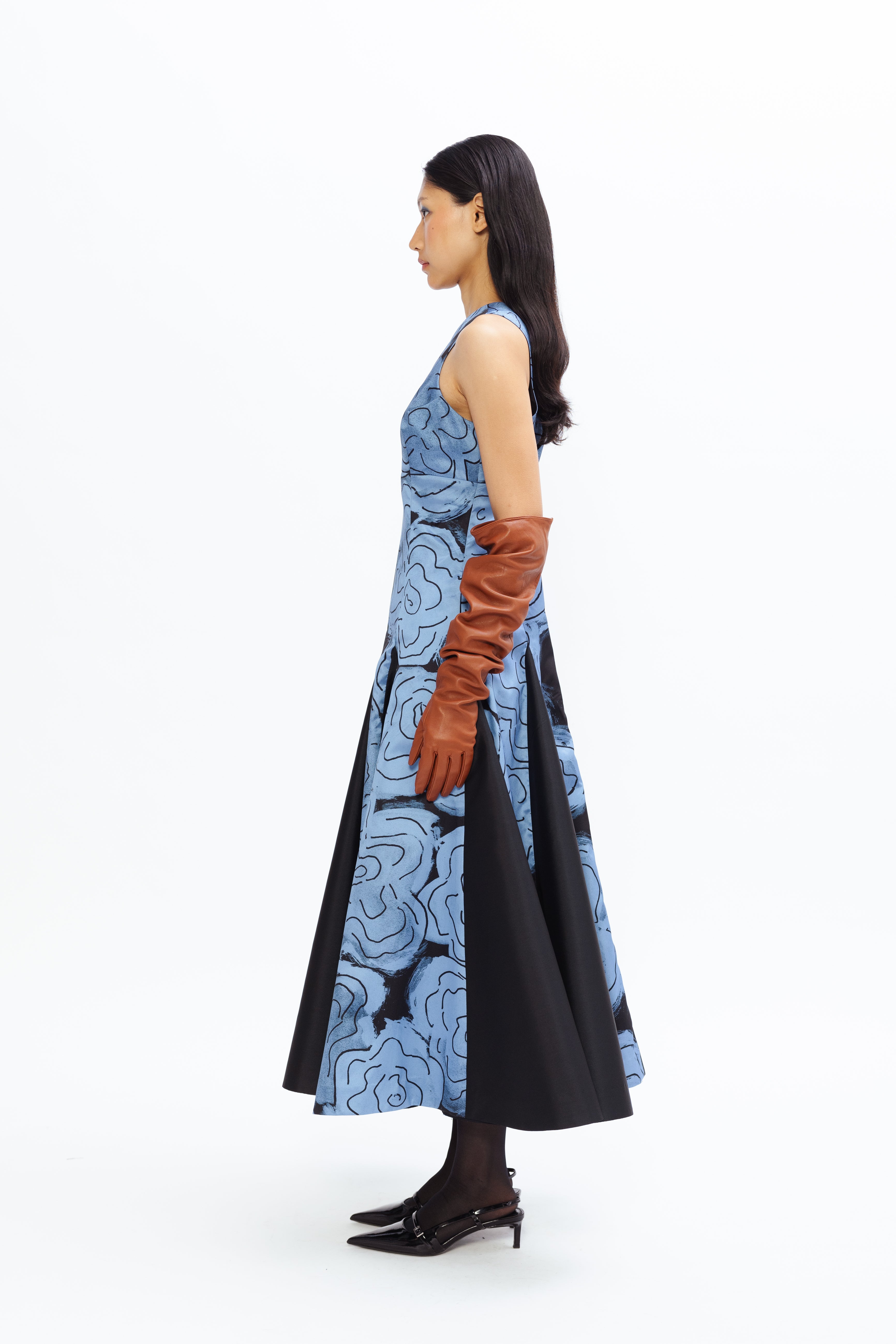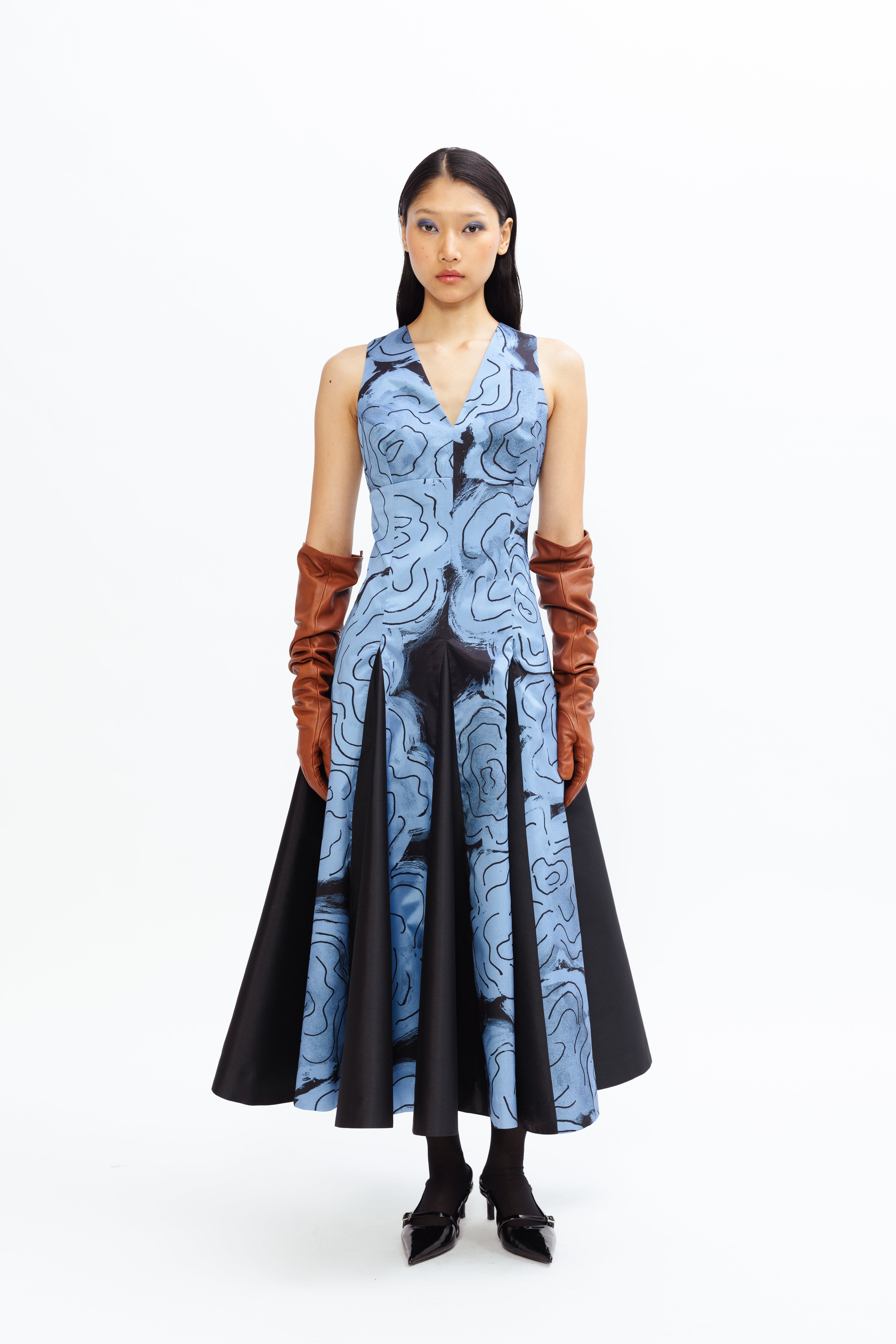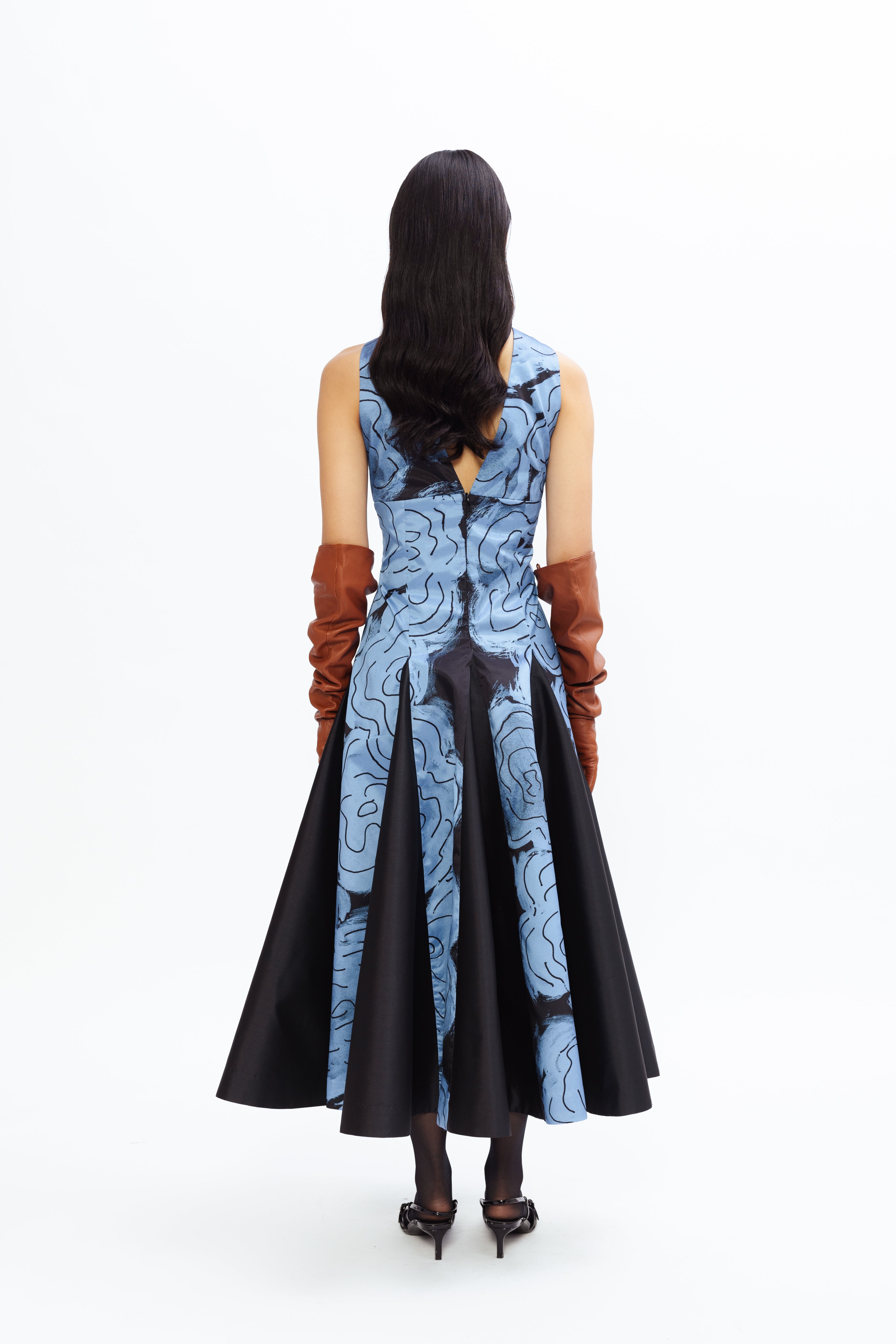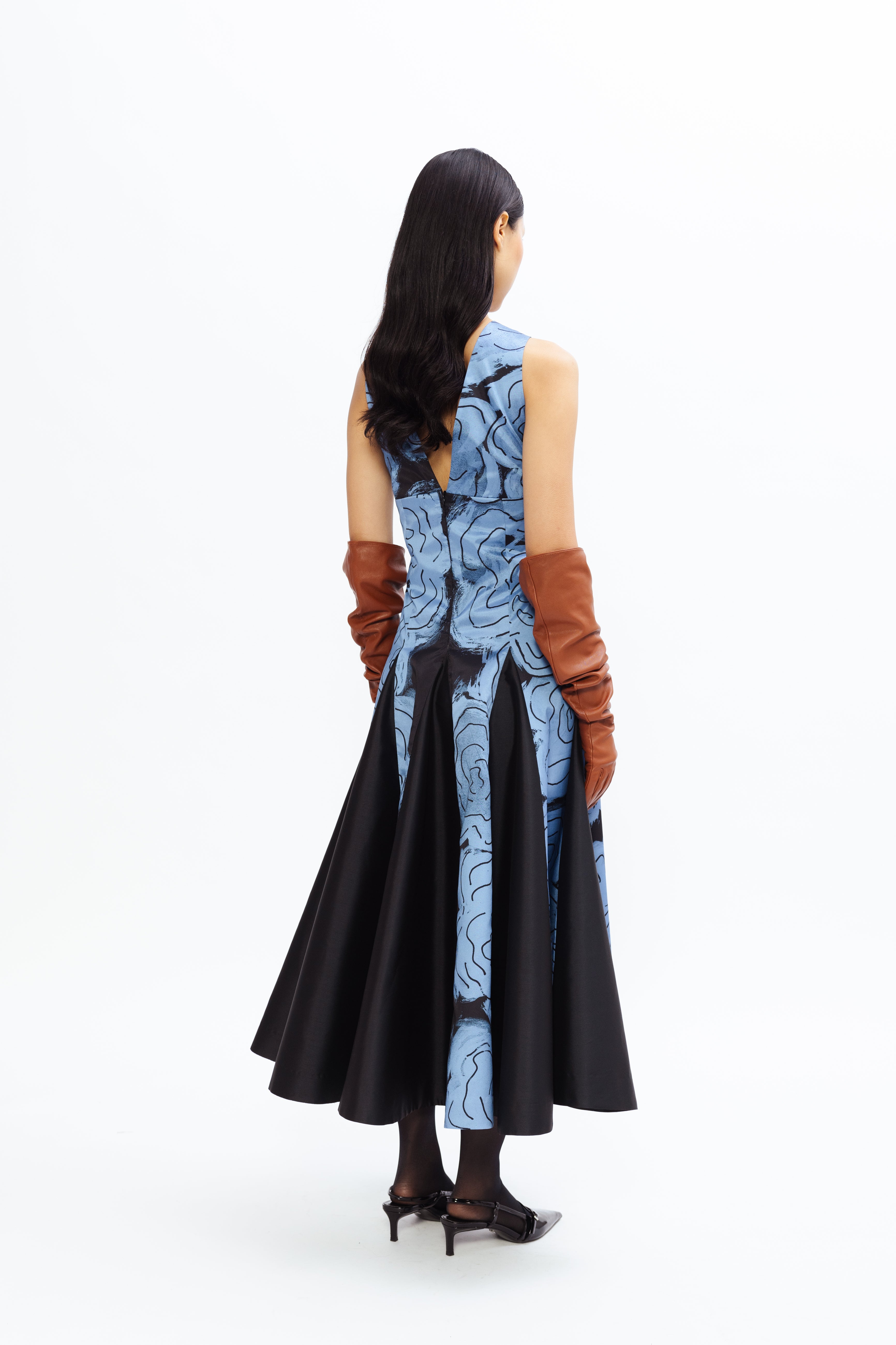 This sleeveless fit-and-flare dress features a structured V-neck bodice that creates a sleek, modern silhouette. The contrasting print and black panel detailing on the flared skirt add dynamic movement and visual intrigue. Perfect for formal dinners, cocktail parties, or gallery openings, it effortlessly blends bold style with timeless sophistication.