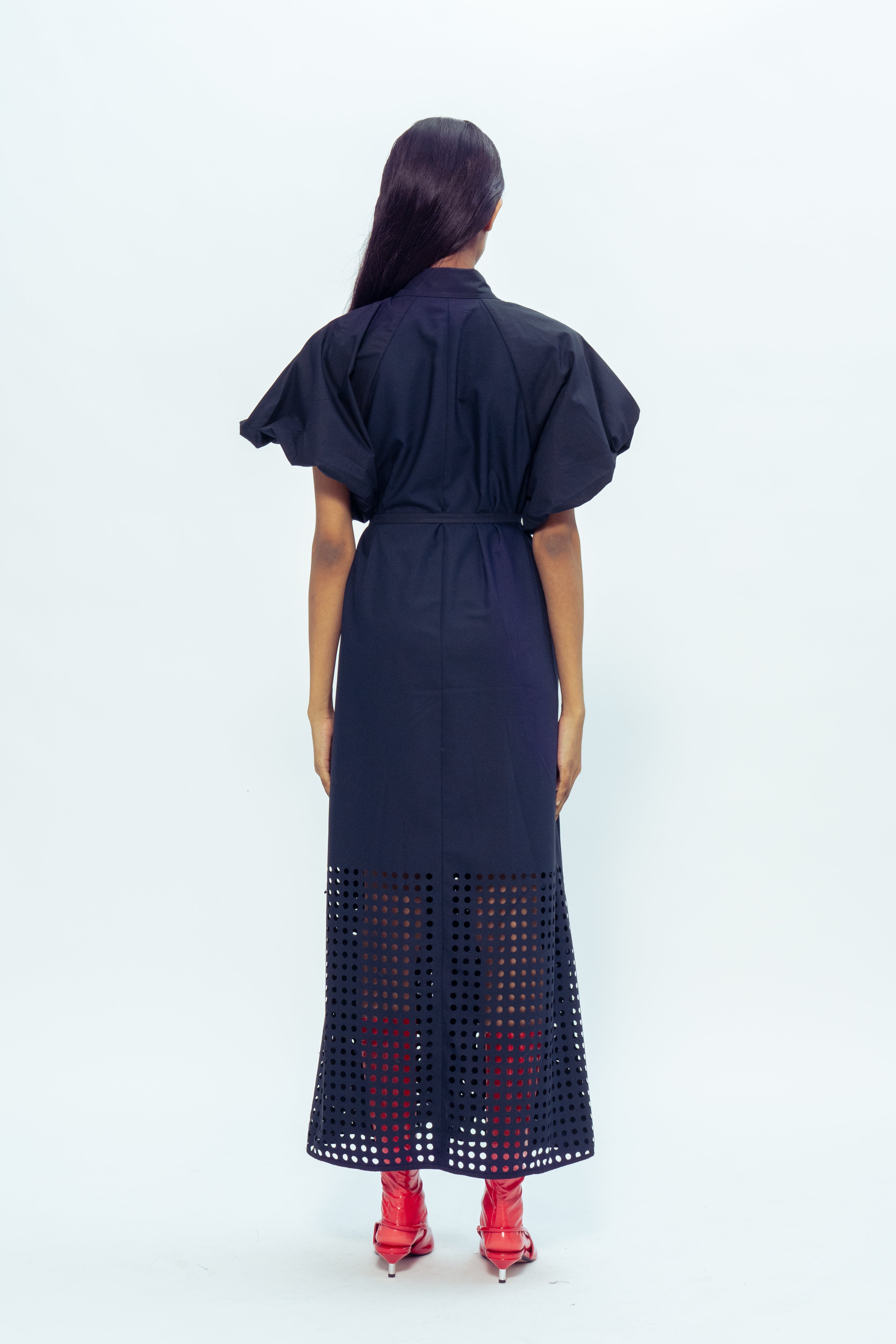 This stylish dress features puff sleeves and delicate laser-cut mesh detailing for a soft, feminine look. The included belt helps define the waist and adds a polished touch. Easy to dress up or down, it’s perfect for daytime outings or evening events.