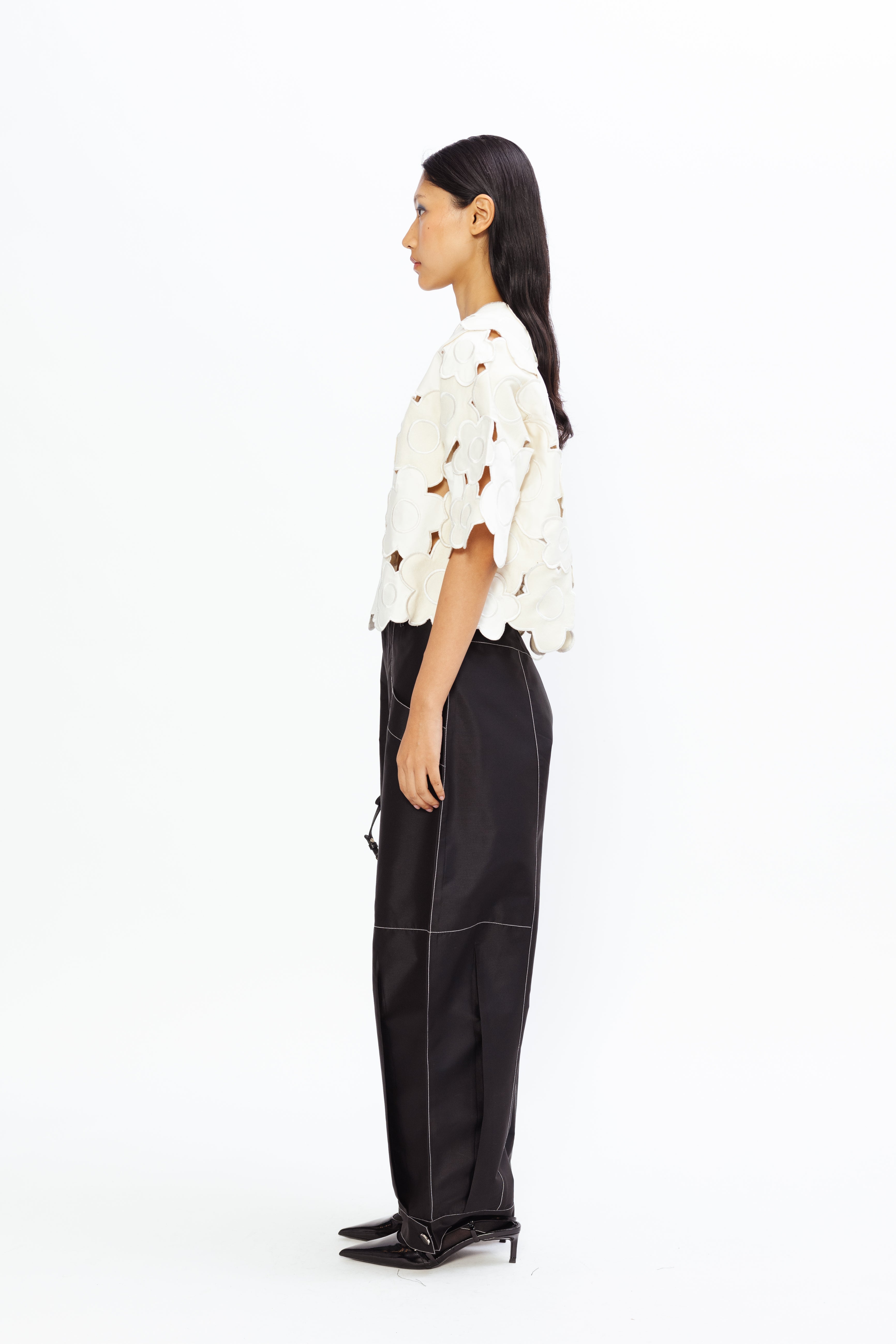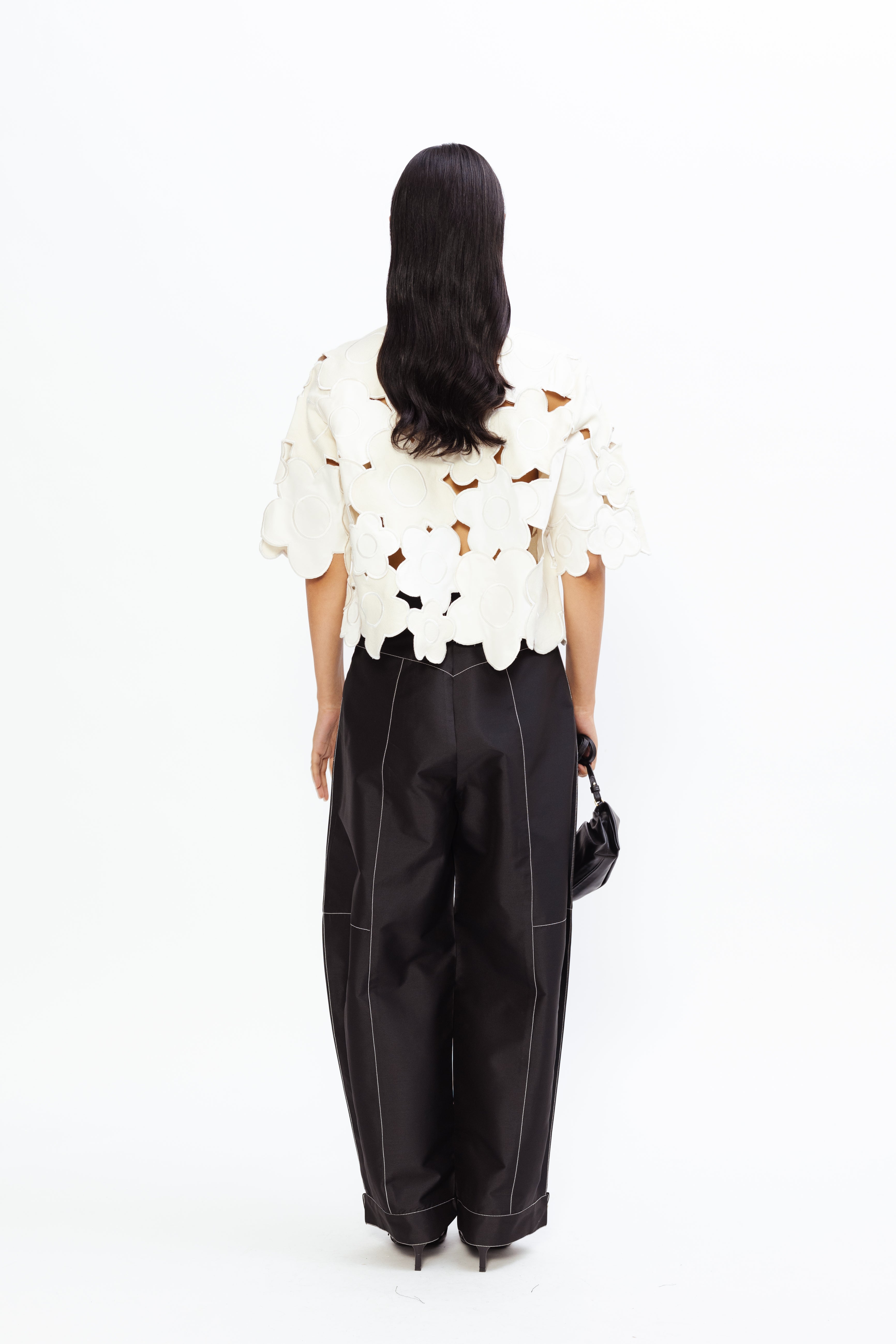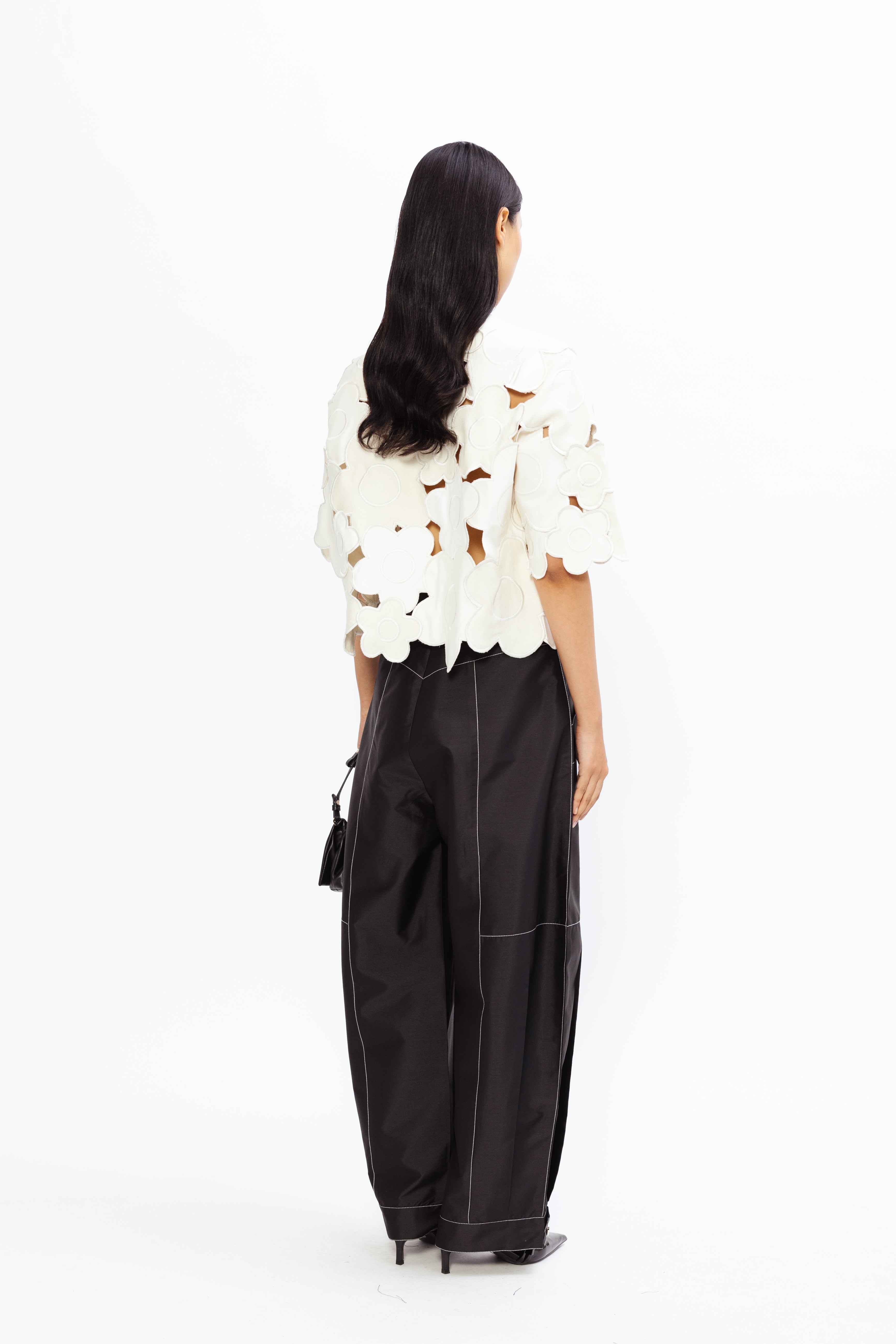 Carrot-fit trousers crafted in taffeta, detailed with contrast top-stitching for a subtle yet striking finish. The tapered silhouette flatters the figure while offering ease of movement, and the tailored design ensures a polished, contemporary look that transitions effortlessly from day to evening occasions.