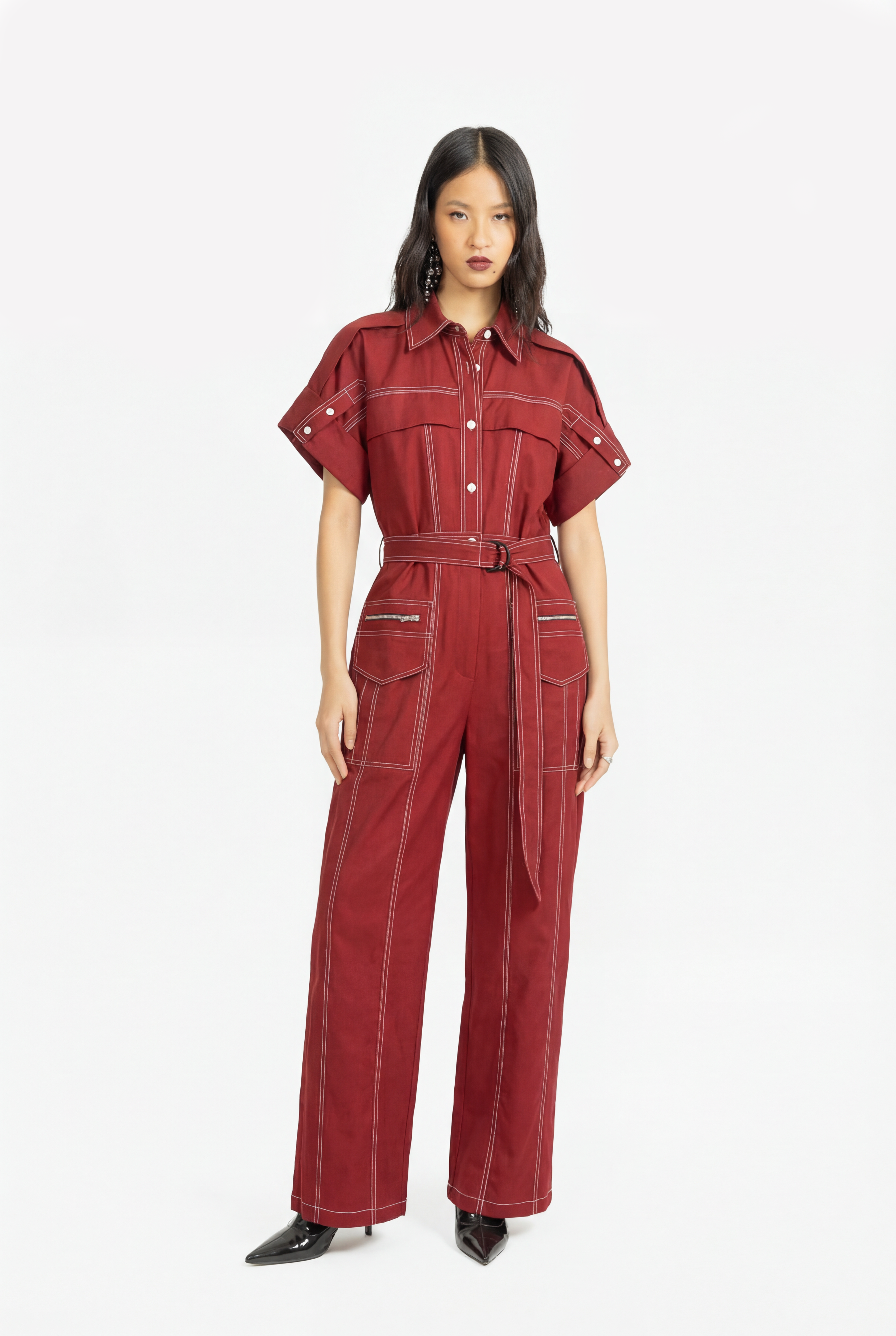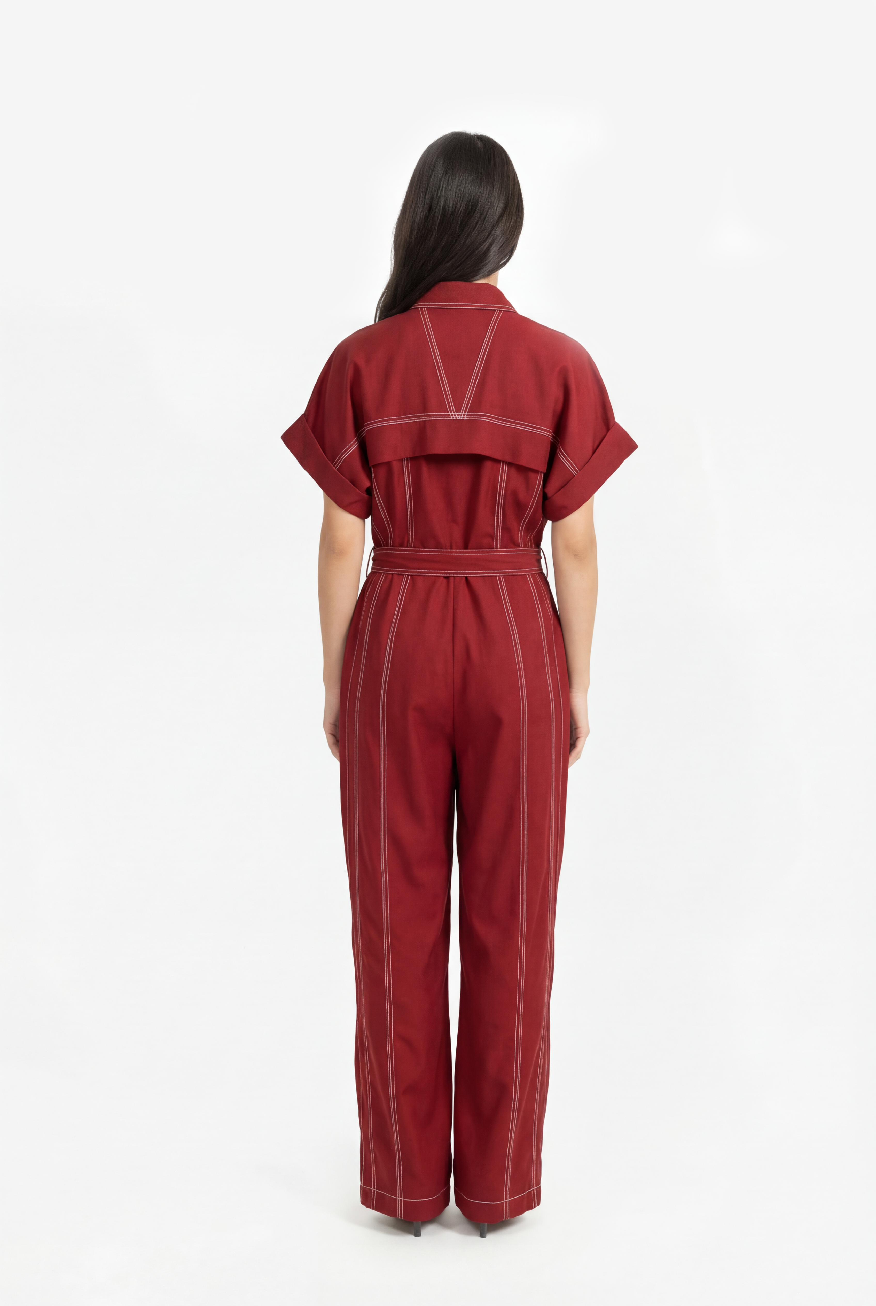 This jumpsuit with a front zip and contrasting topstitching, giving it a modern, structured look. The zip offers convenience, while the topstitching adds visual interest. It's a trendy and versatile piece.
