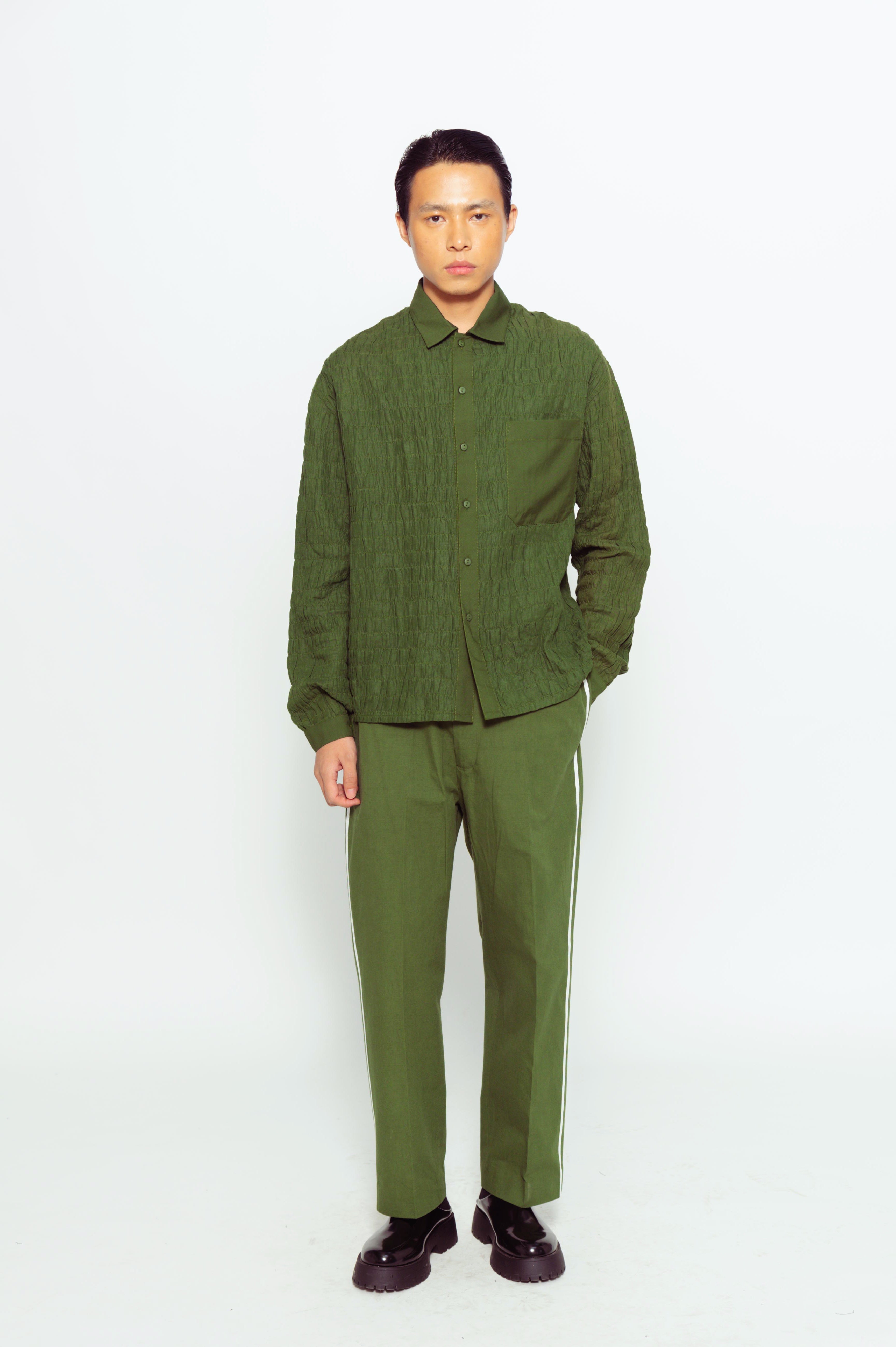 This men's handloom linen full-sleeve shirt with shirring detail offers textured gathers for a stylish, comfortable, and unique look.