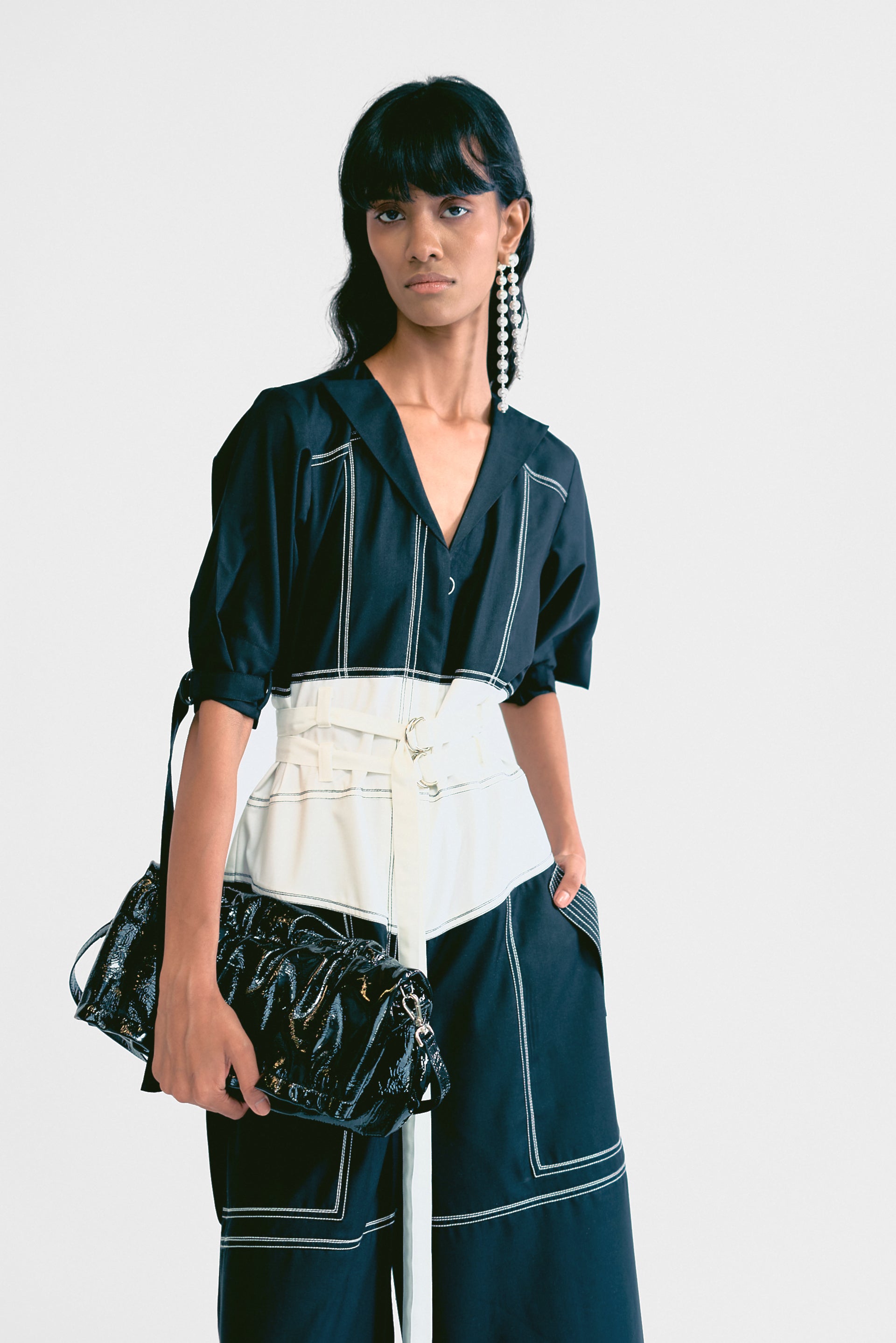 A sleek and modern jumpsuit featuring a contrast double-belt design and intricate top-stitch detailing. Perfect for a bold and sophisticated look.