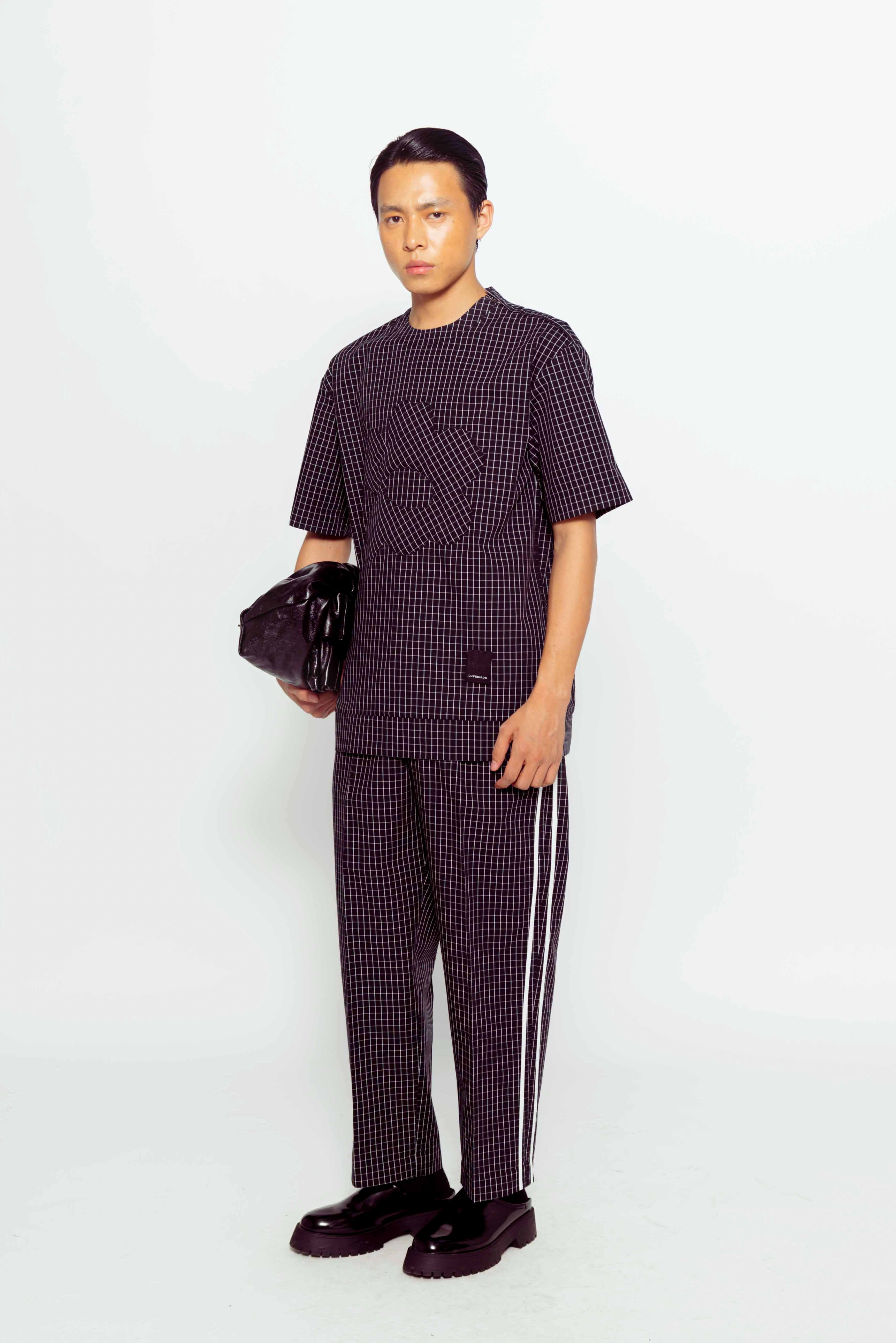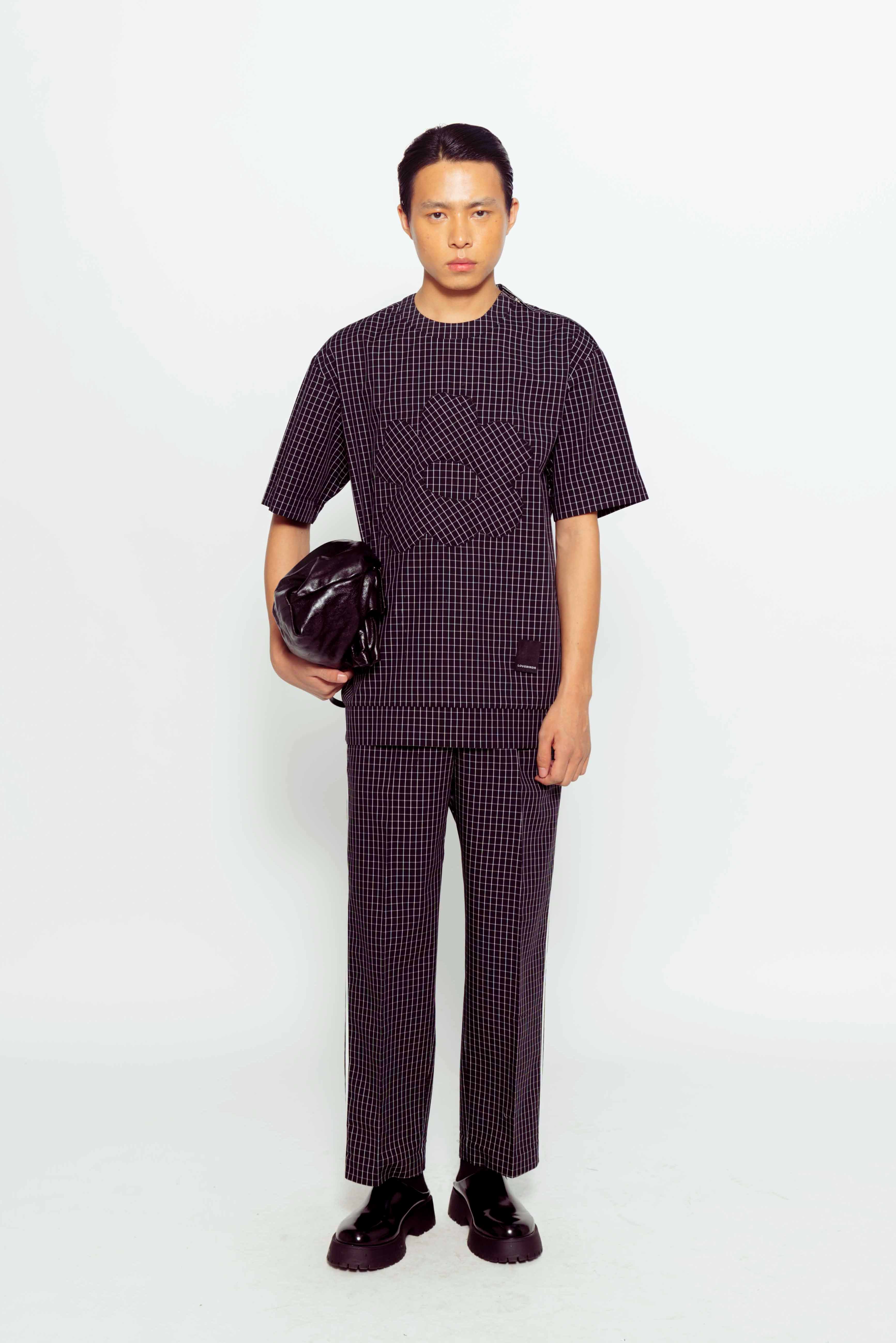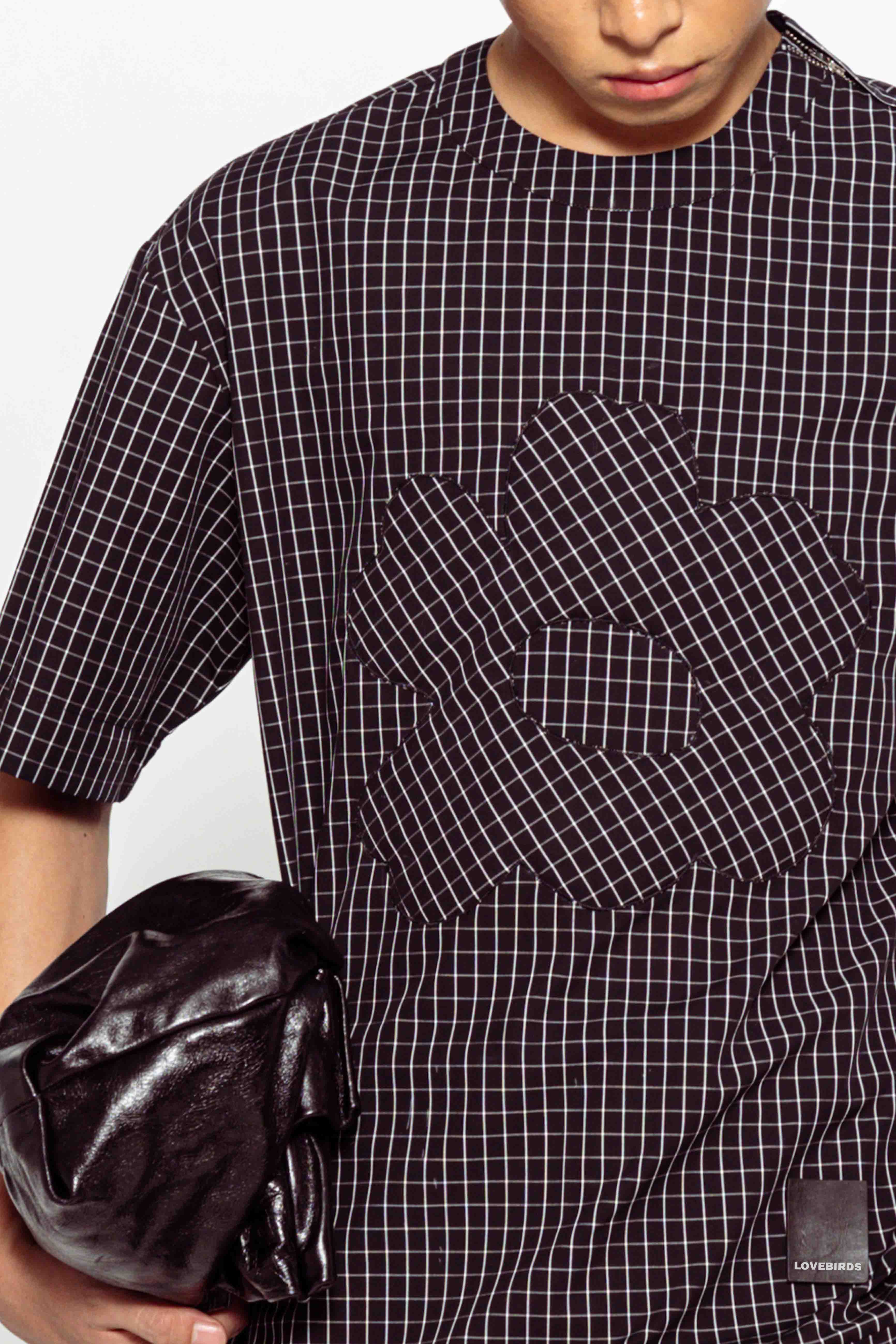 This self-checkered half-sleeve cotton shirt features a subtle check pattern, a soft quilted flower applique, and an opening at the left shoulder for a modern touch. This design combines comfort with a stylish, unique look.