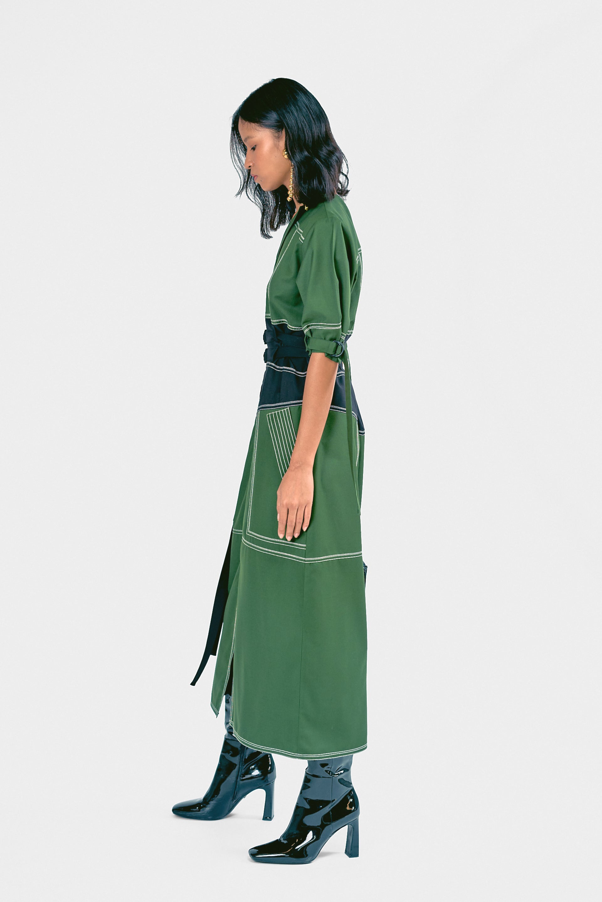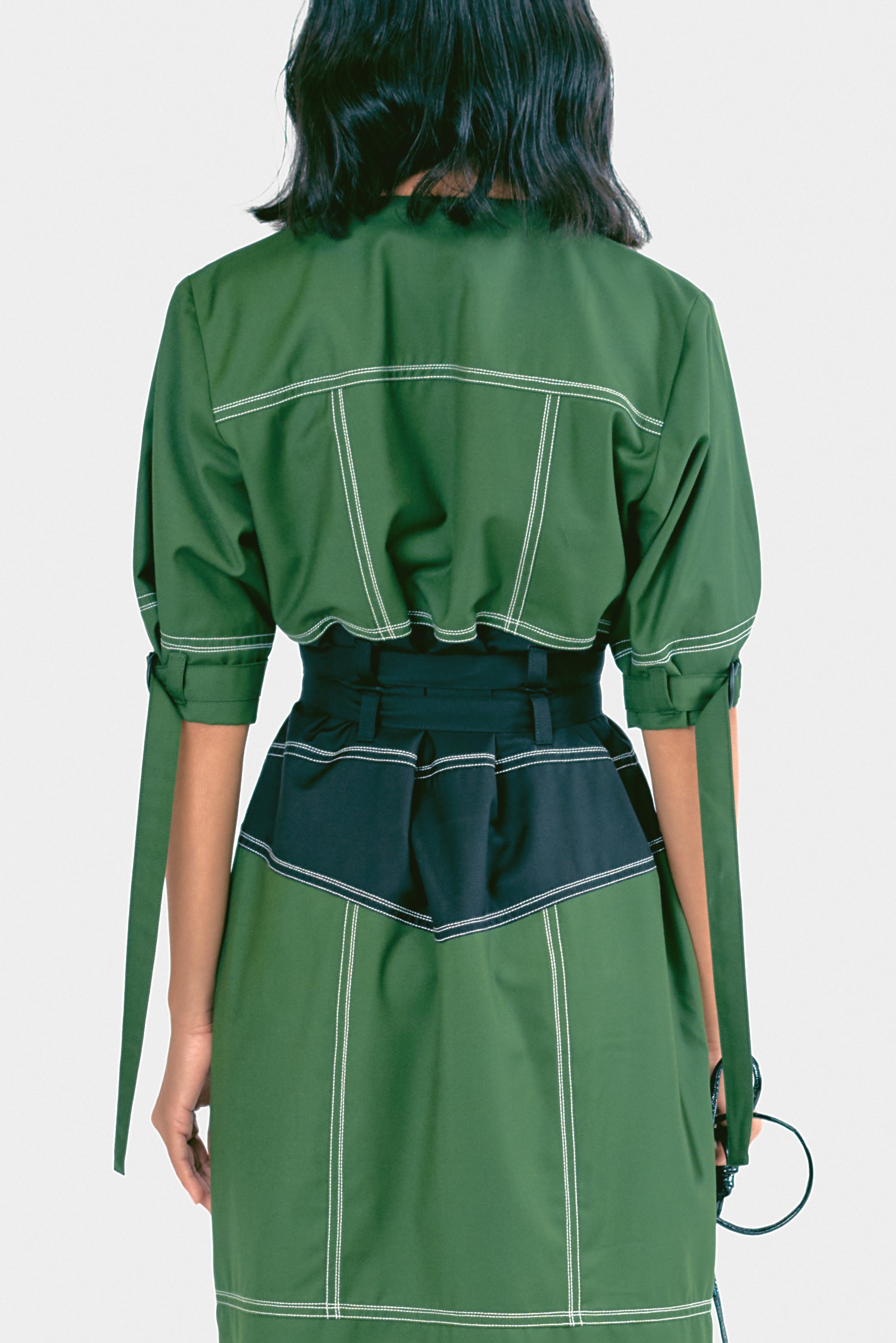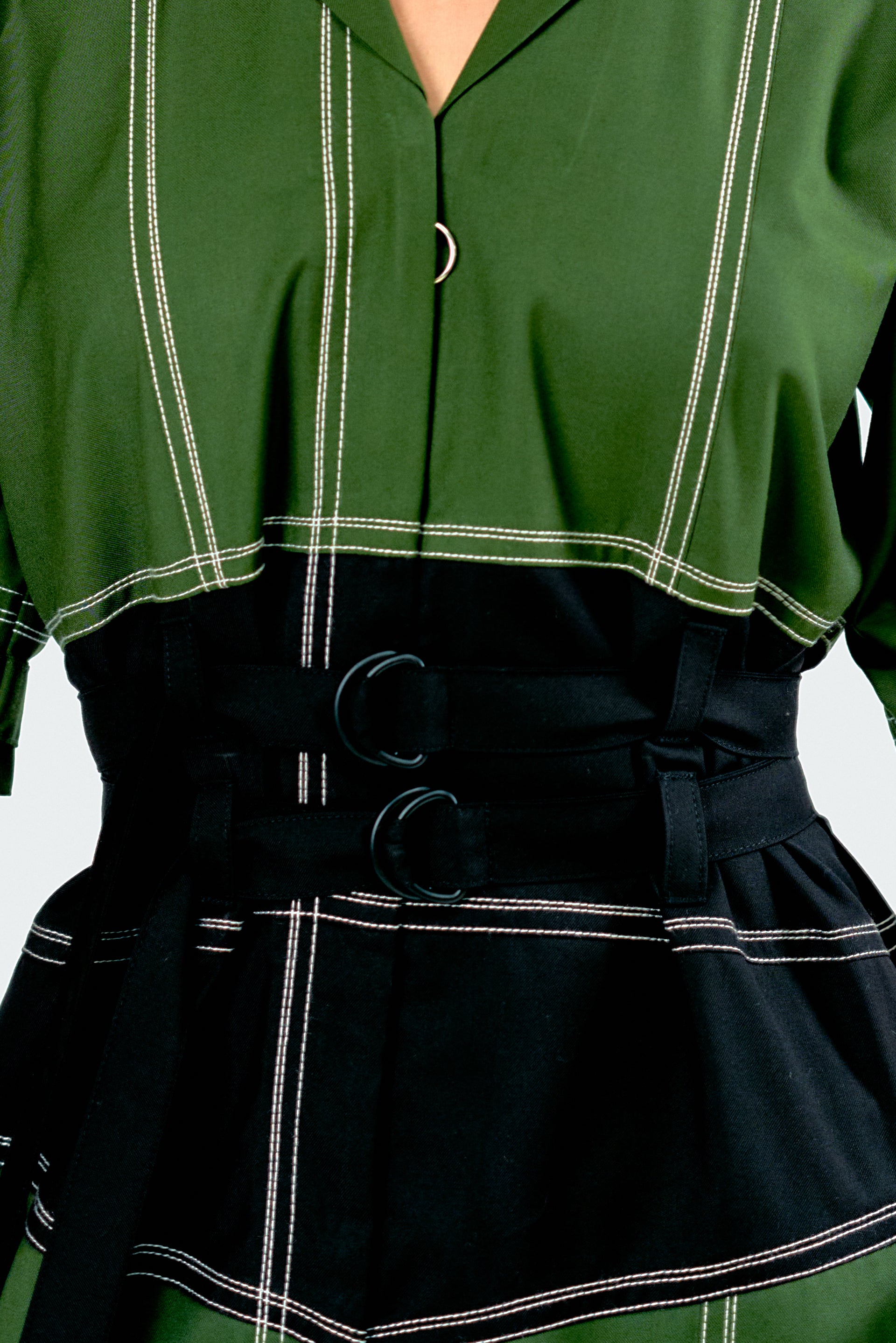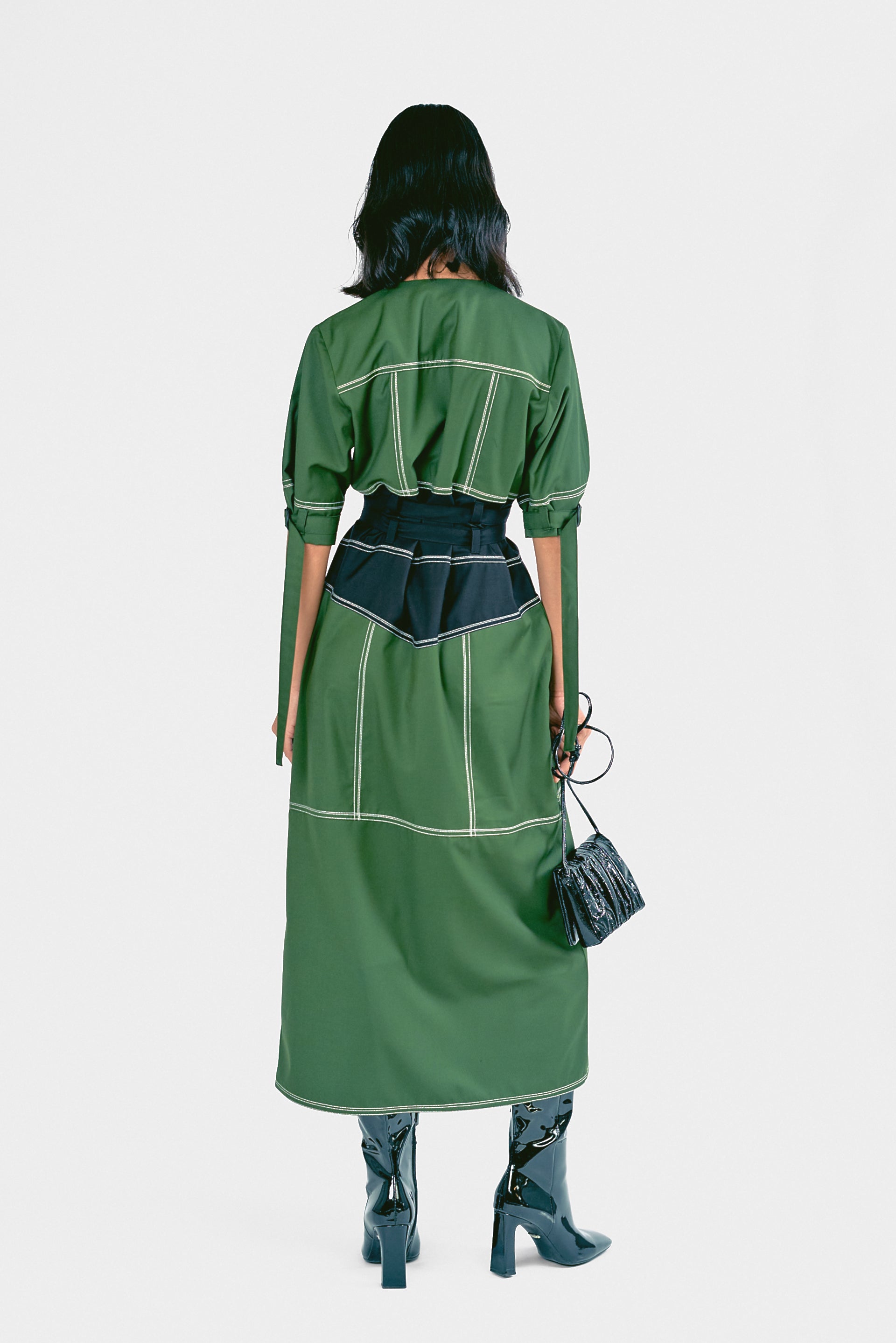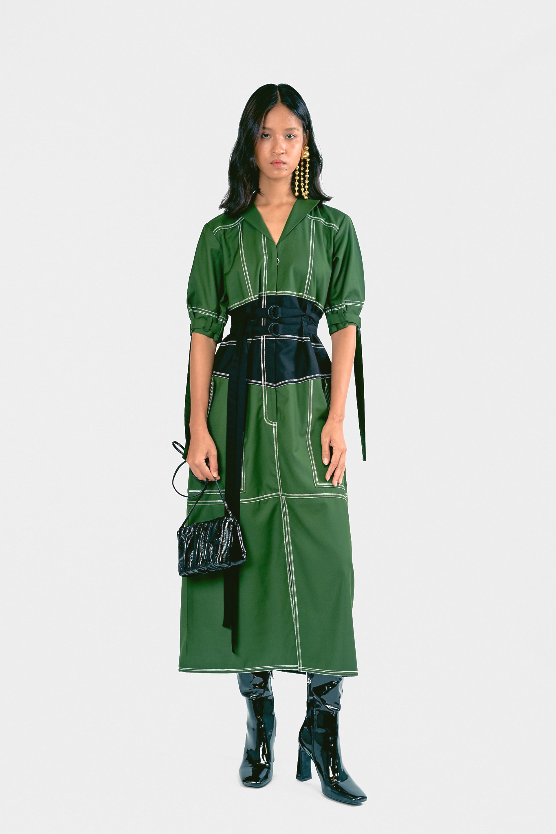 This stylish midi utility dress blends function with fashion. Featuring contrast top-stitch detailing, a waist-cinching belt, and practical pockets, it’s perfect for effortless everyday wear. The button-down front and classic collar add a polished touch, making it easy to dress up or down.